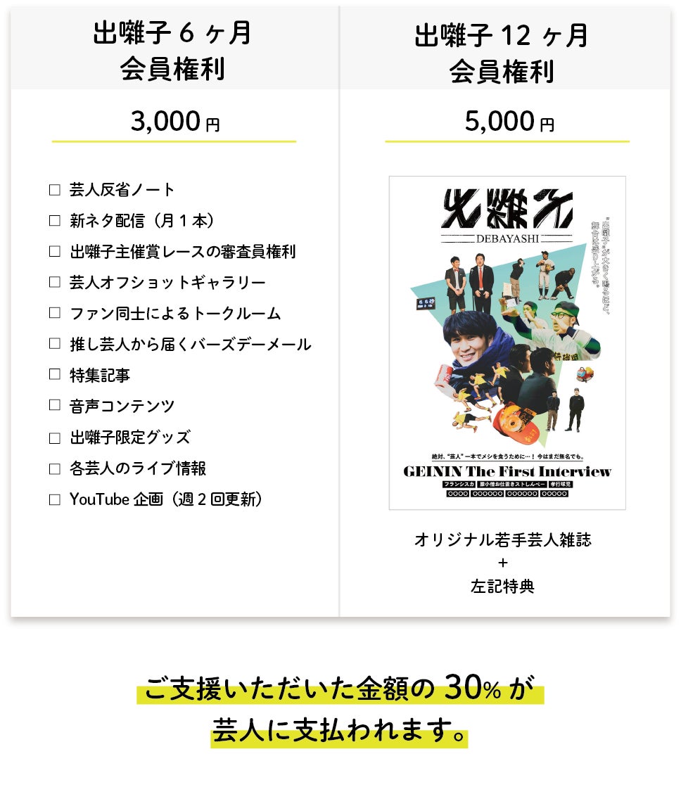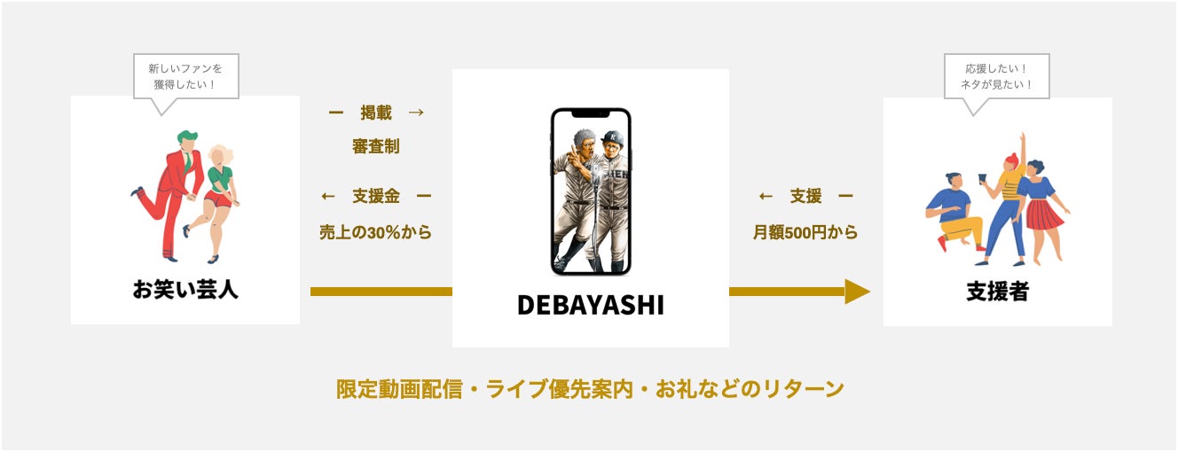また、今回のクラウドファンディングでは、出囃子早期入会キャンペーンとして、ご支援いただいた方は、4月5日オープン予定の芸人応援サービス『出囃子-DEBAYASHI-』の月額利用料がお得になります。