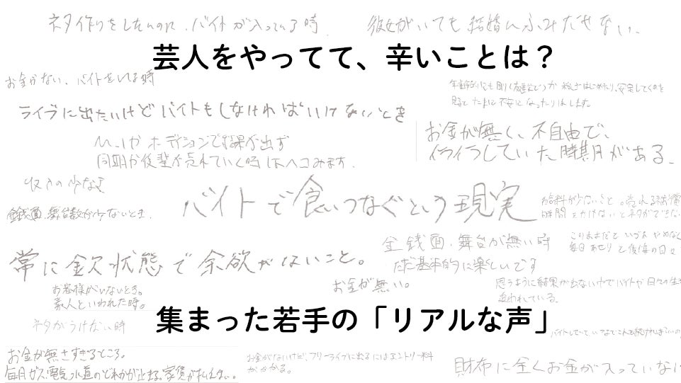 芸人としての収入はほぼゼロで、週5日、多い人では週7日アルバイトに入っている方もいました。