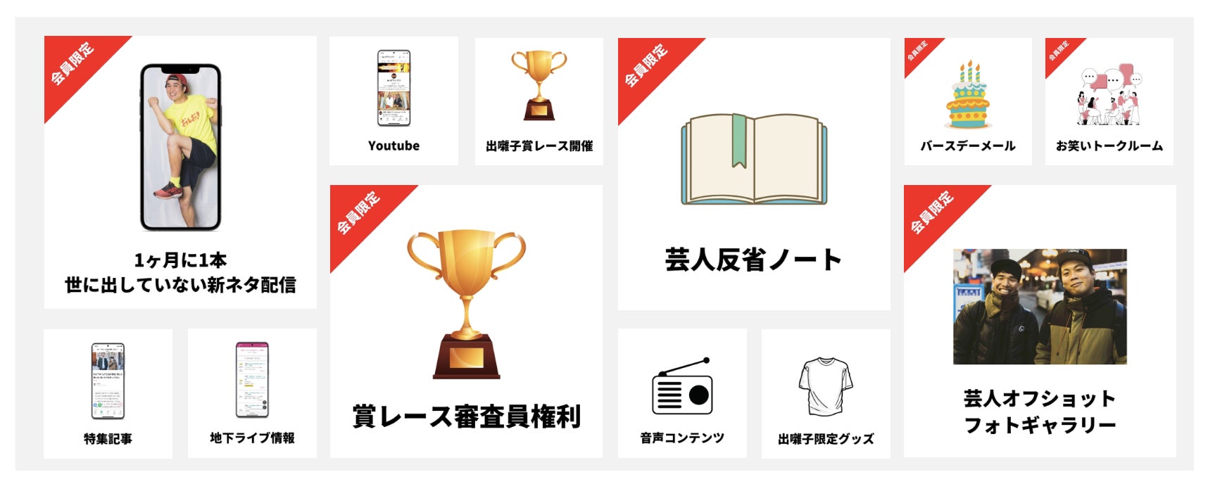 その他、会員特典として、芸人が不定期にお届けるする反省ノート、推し芸人から届くバースデーメールなどの出囃子でしか味わえない特典をご用意しています。