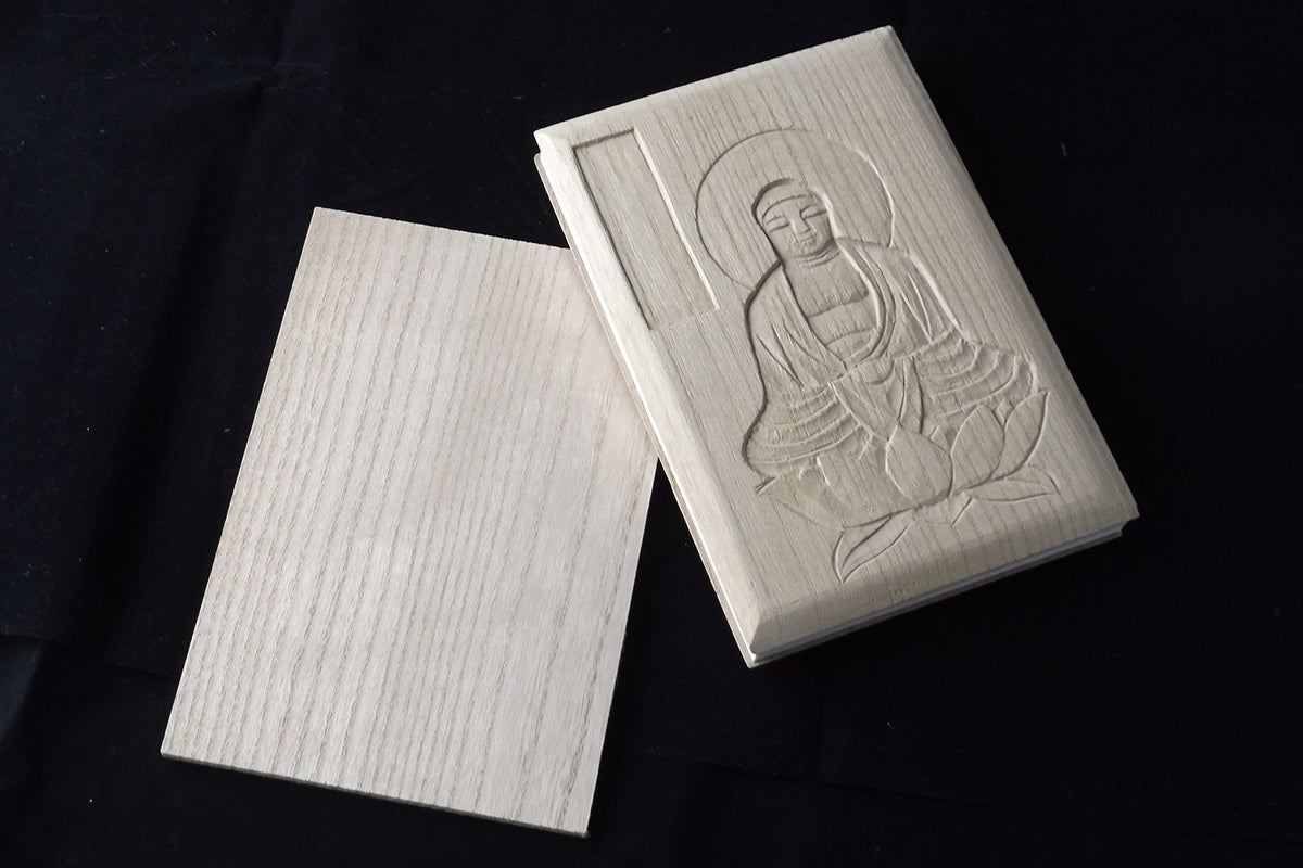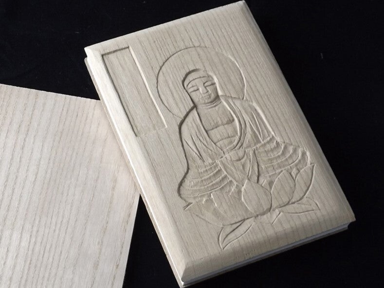 仏様を彫る技術は、伝統仏教美術として飛鳥時代より継承されてきたものです。私自身、拝んで頂ける仏様を彫るために、理想とするお姿を求めてまだまだ日々勉強中ですが、この御朱印帳を手に取って頂いたみなさまがそれぞれの思いを込めて頂けるよう、最後にお釈迦様のお顔を仕上げるときには、無心の心で彫らせて頂きました。