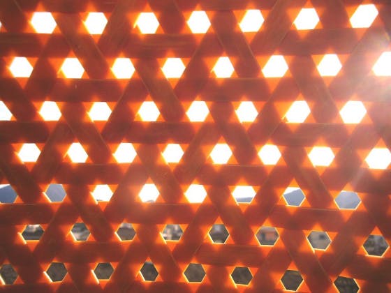 そして、上に貼ってあるのは「鉄線(亀甲)編み」です。リターンでは「尺皿」がこの編み方です。上記と同様、鉄線の花のよう、亀の甲羅のよう、ということですね。光に透かすと、思いがけないカタチが現れたりして面白いです。
