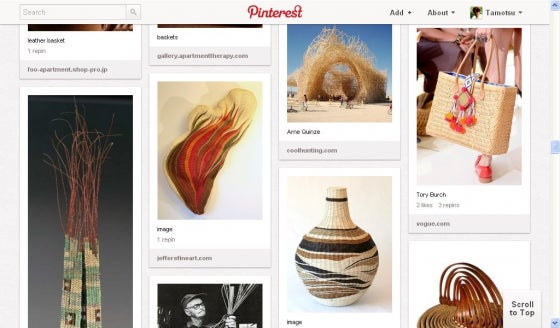“かご好きな女性の意見”のほかに参考にするのは、例えば上写真の「Pinterest」というサイトなど。さまざまな素材のかごを眺めていると、仕事を忘れてうっとりしてしまうこともしばしばです。(Pinterestは、要は、WEB上にある好みの写真をカテゴリ別にコレクションしている感じです。僕のページはコチラ)