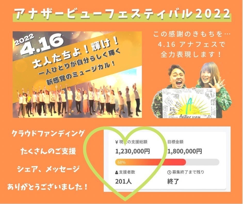 2022/04/05 19:00クラウドファンディング終了しました応援してくださった方々ありがとうございました‼=================4月3日プロジェクト終了しました!総支援額▶︎1,230,000円総支援者▶︎201名 本当にありがとうございます!!僕たちがこのイベントを開催できるのは これまでの人生で出会った方々や支援してくださった201名の方々をはじめその向こう側にいる本当に数えきれない人々これまでの人生で起きたきっかけの連鎖、、、 全てが詰まっていてみなさんと一緒に作らせてもらっているという気持ちを改めて感じています。 こんなに想いのこもった大切なお金を受け取らせていただき胸が熱いです。 正直、クラウドファンディングを行うにあたって 賛否両論、意見を頂いたのも事実です。 それでも、挑戦すると応援してくれたり協力してくれる人が必ず現れるというのを可視化したい。 挑戦する人たちの背中を押したい。 アナフェスもクラウドファンディングもそんな気持ちで開催させてもらいました! アナフェスでの【挑戦】というのは何か大きなことを成し遂げるというよりも 心の中で「本当はこうしたい」という気持ちに気付き一歩踏み出すことを大切にしています。 今回で言えば・大切な人に応援して欲しい伝える・嫌なことを嫌という・やりたいことをやりたいという・助けてって言う・思ったことを相手に伝える・辛いときは辛いという・仲間を信じる そんな【挑戦】はステージに立って自分を表現することよりも100倍価値がある。正直、ステージに立つよりも怖いです。 一人ひとりの【挑戦】の積み重ねがアナフェスで、結果として大きなイベントになっています! アナフェスを創り上げる期間やクラウドファンディングをきっかけにその挑戦を乗り越え、メンバー一同より一層、輝きが増しました!!そんなアナフェスメンバーのステージを楽しみにしていてください! クラウドファンディングは昨日で終了しましたが4月16日のイベント当日までチケット販売をしております♪/ アナフェスメンバーによる 1人ひとりが輝く新感覚のミュージカル\に加えて/ Specialゲスト 歌手 天道 清貴 / Tendo Kiyotakaさんの出演\ 更に4/24には・クラウドファンディング支援者・アナフェス出演者・アナフェスチケット購入者 限定無料で/心の専門家 惣士郎 そうしろうさんによる"自己表現で生きていく"をテーマにしたトークライブ\ があります!!豪華すぎる。笑 チケットが買えなかった人お友達にも紹介したい人などまだチケットはお買い求めできます♪お求め先はこちらです↓↓↓https://anotherview.thebase.in/ 最後になりましたがご支援、ご声援、本当にありがとうございました!引き続き4月16日までよろしくお願いします^^ もっと見る