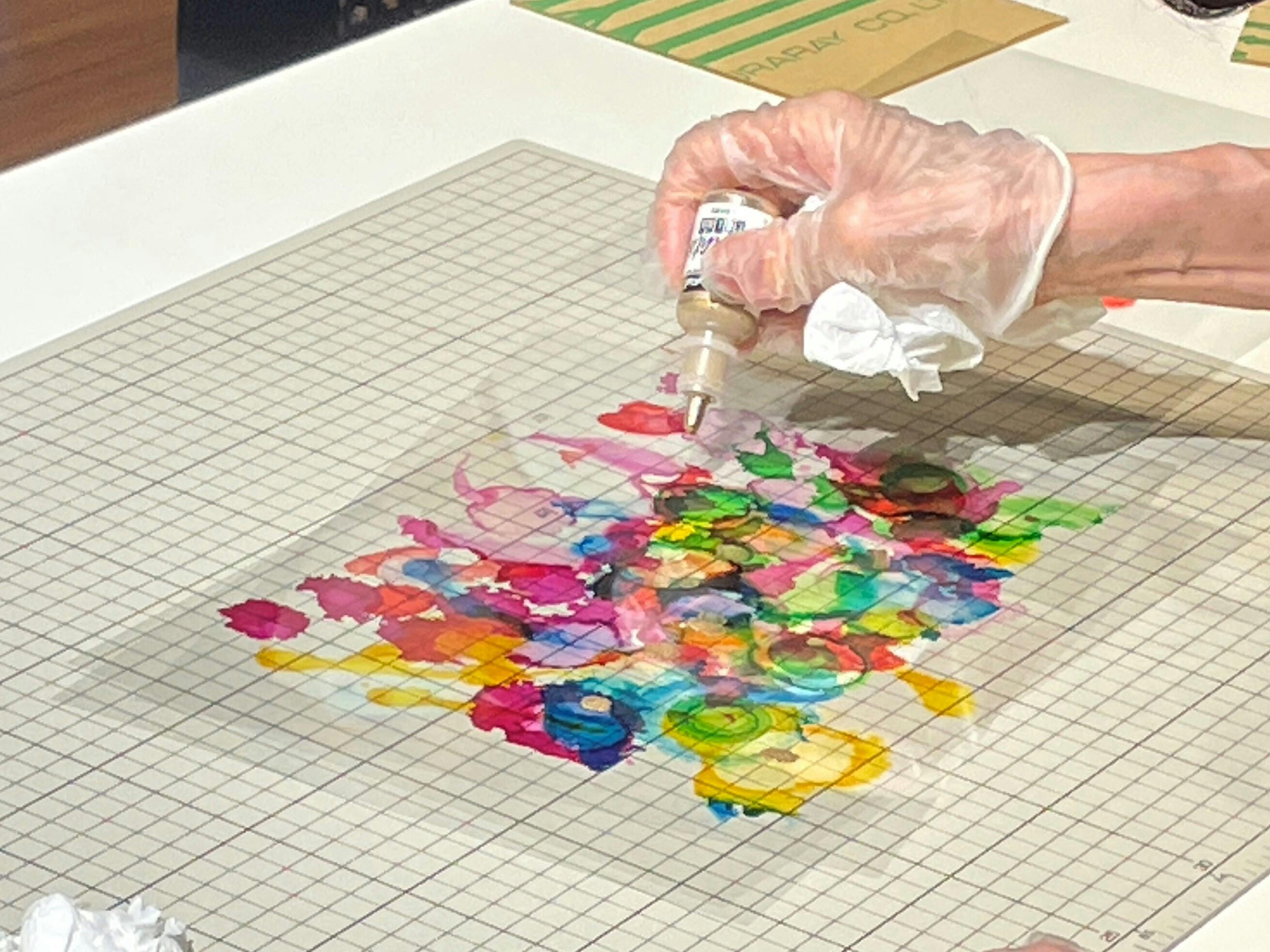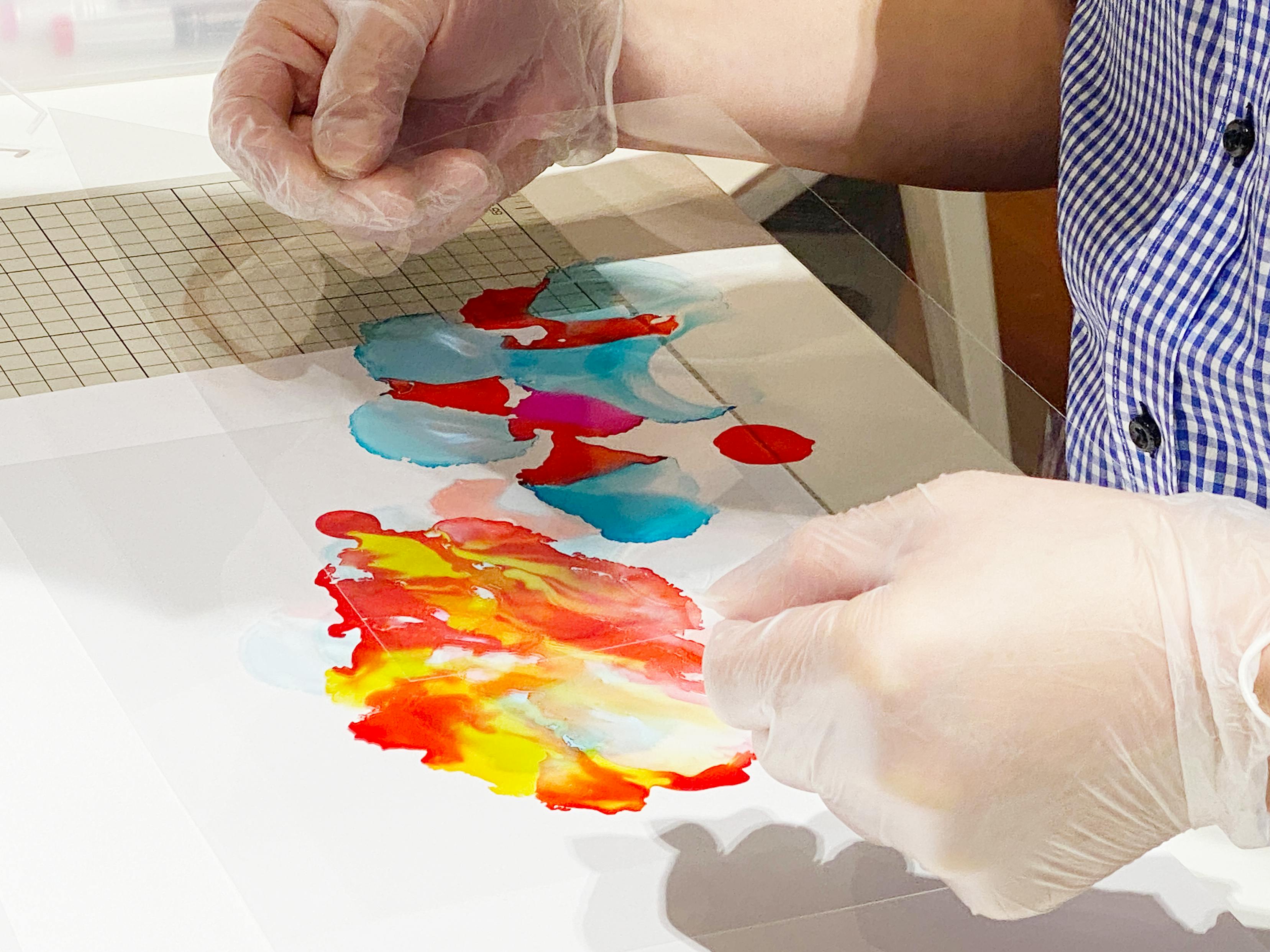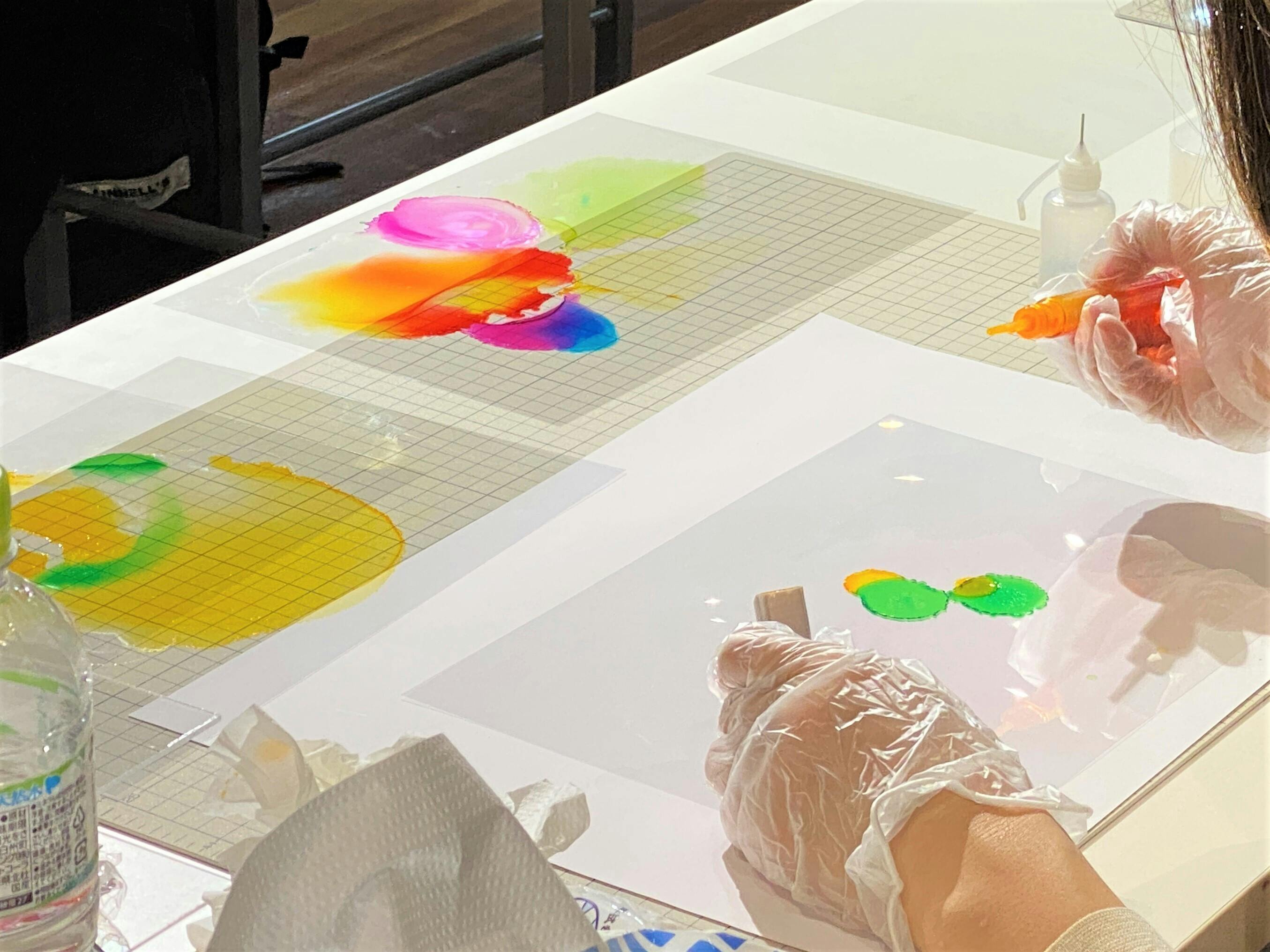 ここではアルコールインクと透明フィルムを使った「重なるインクアート」を制作します。