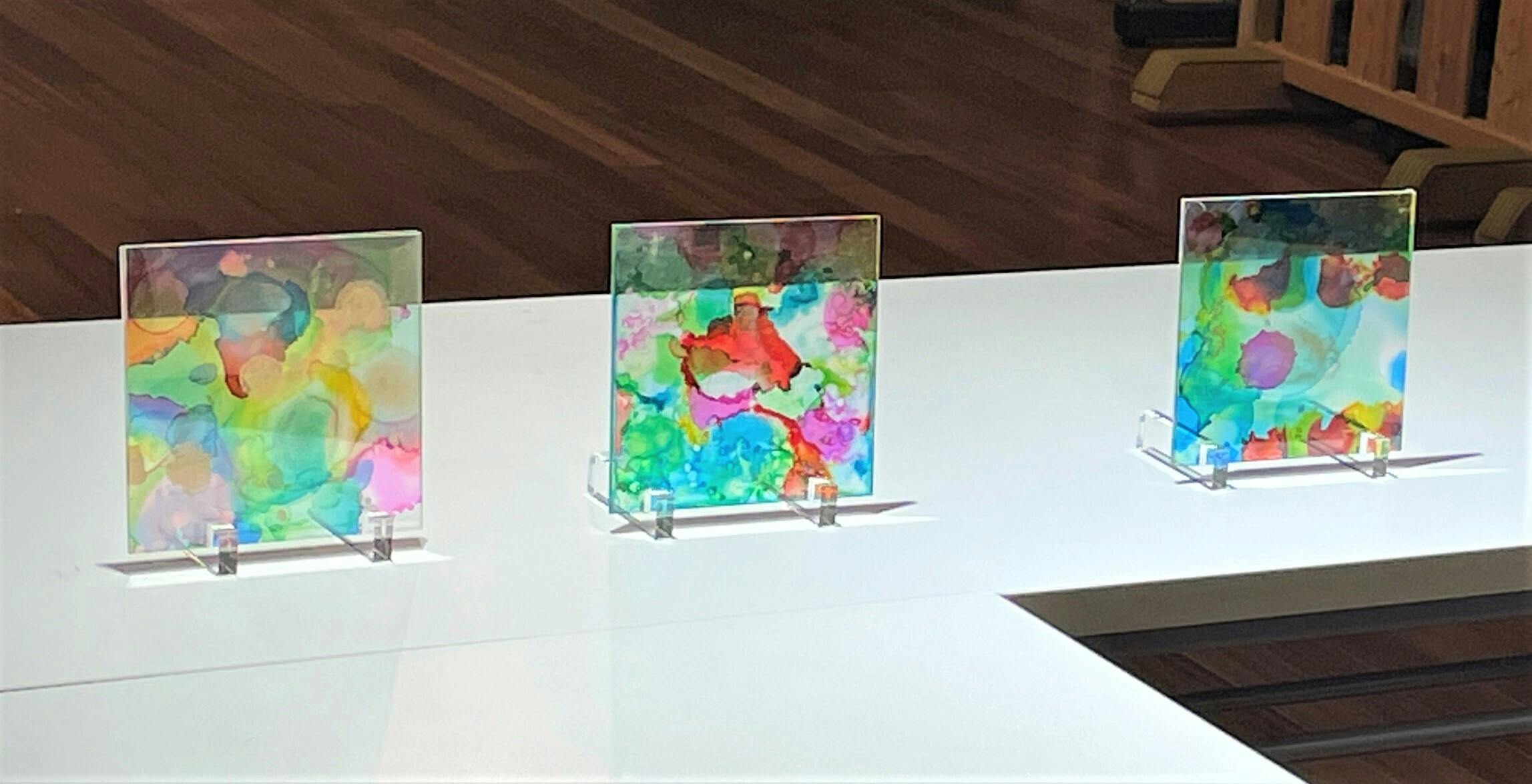 完成品はアクリルプレートで挟み、スタンドに飾れます。この作品が虹彩アートの原画です。原画は当日お持ち帰りいただけます。
