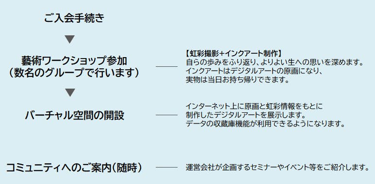 「人生」をテーマとし、人生後半・終盤をプロデュースするワークショップで、自身の想いをかたちにしながら、虹彩アート制作に参加します。出来上がったデジタルアート作品をバーチャル空間に展示。思い出のデータの収蔵庫機能もお使いいただけます。