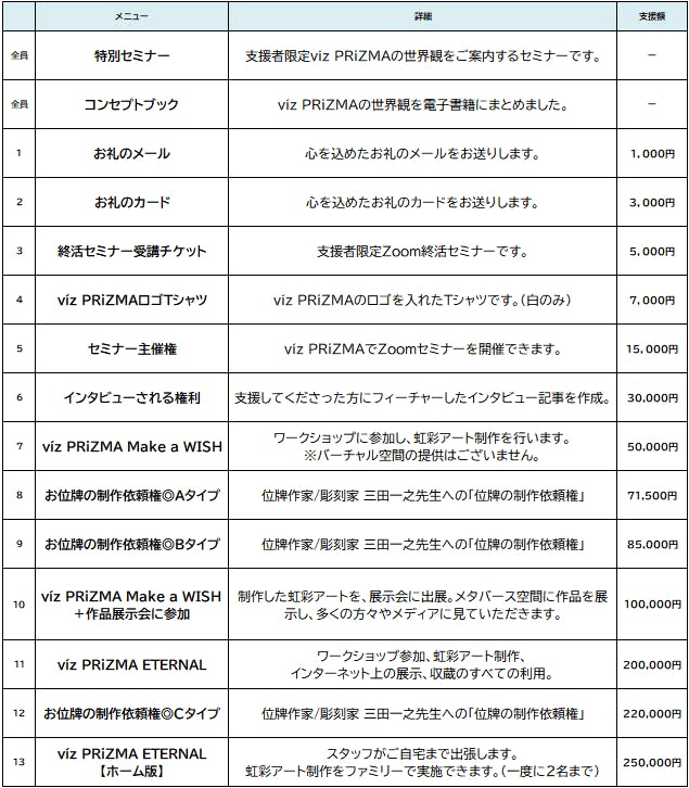 víz PRiZMAをご体感いただけるリターンも各種取り揃えています。