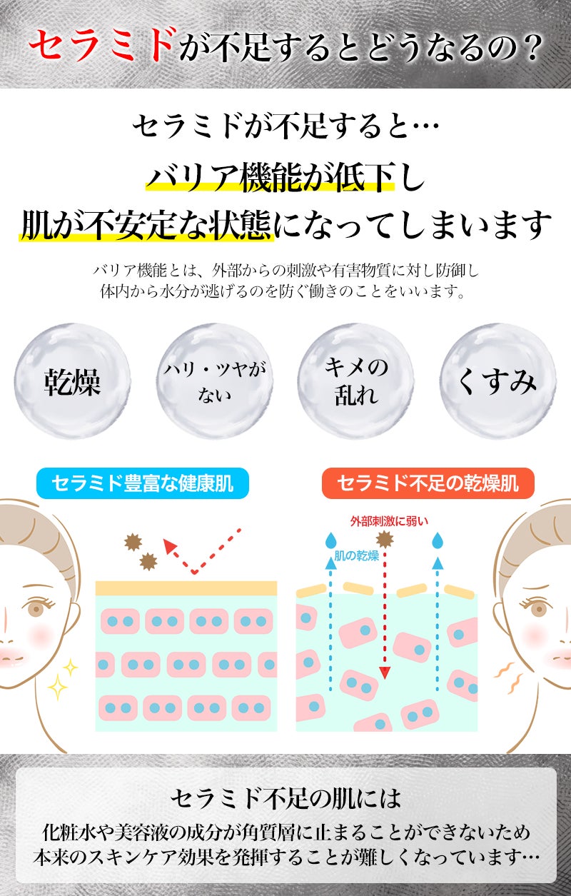 セラミド不足の肌には、化粧水や美容液の成分が角質層にとどまることができないため、本来のスキンケア効果を発揮することが難しくなる。。。そこでセラミドの補給が必要!