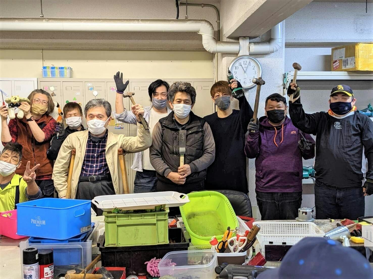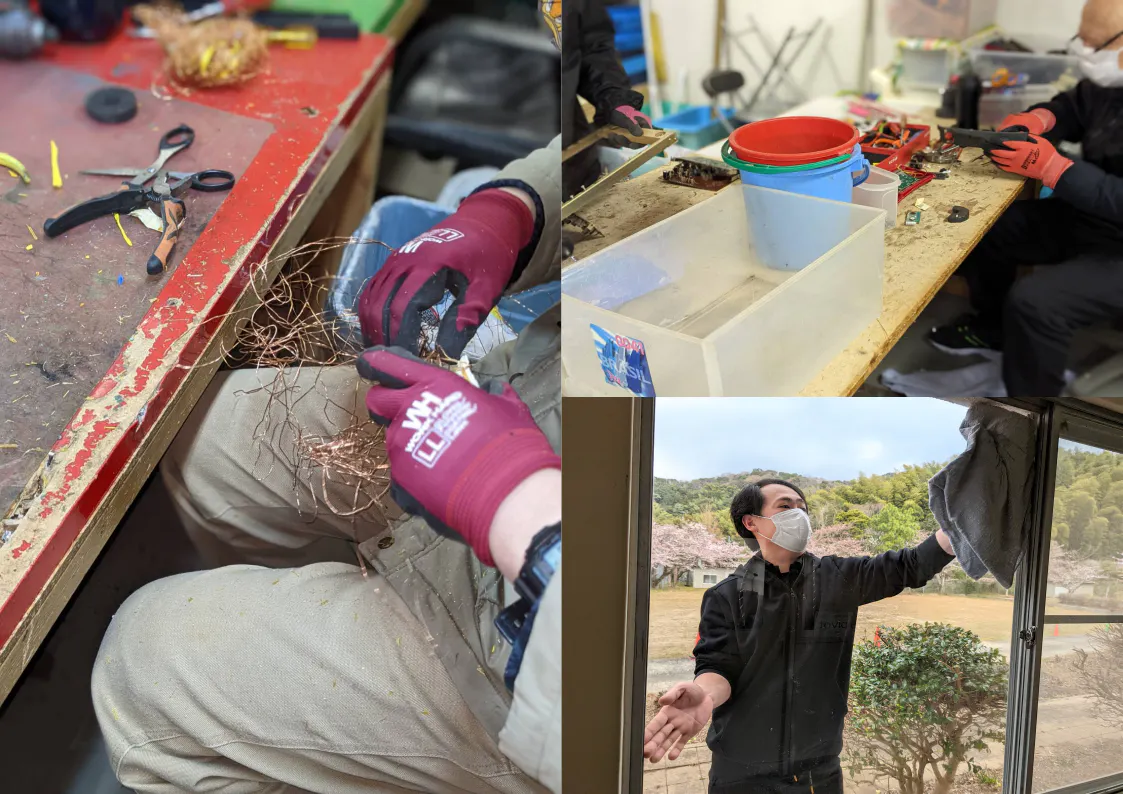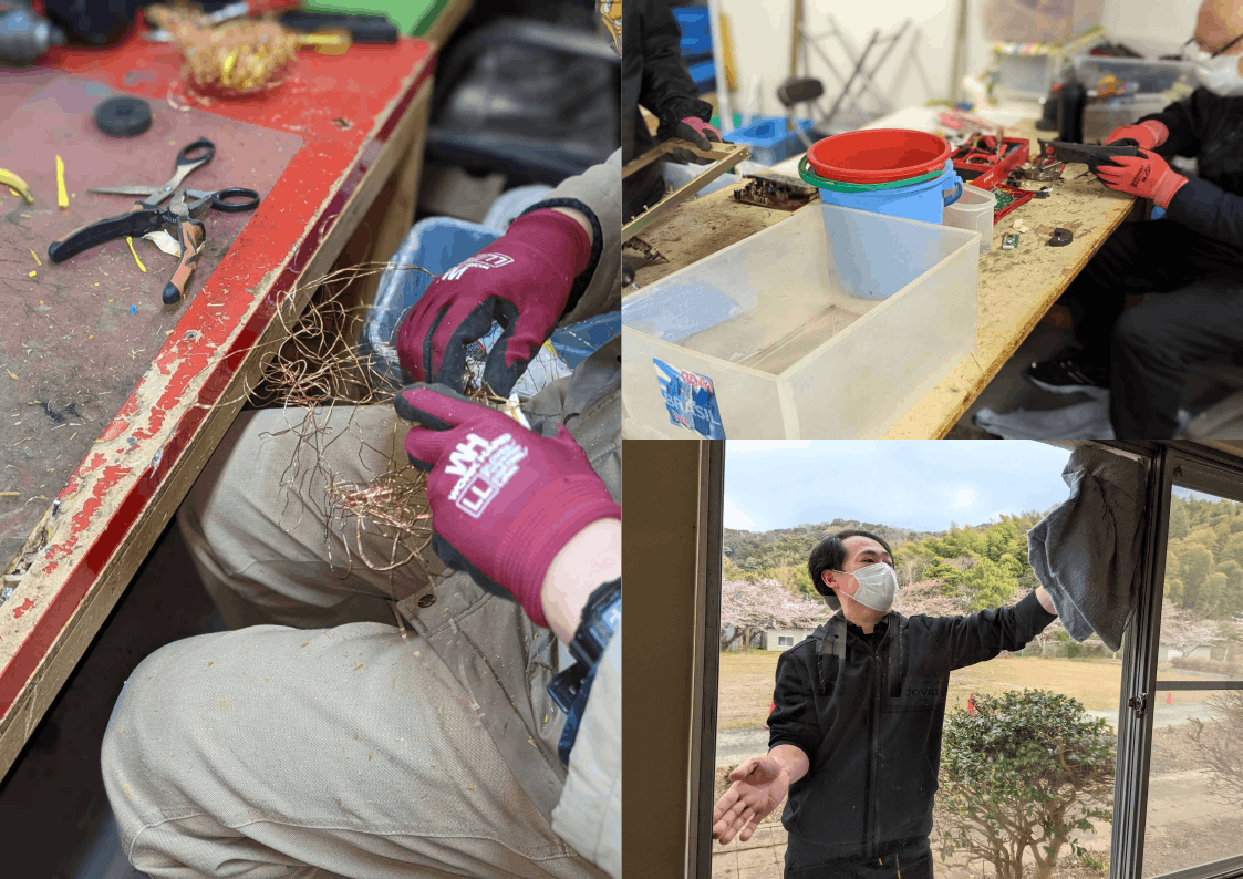 協力企業が回収した不用品を廃校に集め、まずは分別。家電製品、家具、食器、小物など再利用可能なものは清掃して保管。壊れた電化製品は分解して金属などの資源を取り出す。保管場所と作業場所が確保できることで色々な作業ができ、色々な展開を考え実行することが可能になりました。