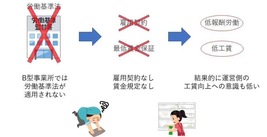 B型事業所は利用者と雇用契約を結ばず、労働基準法も適用されません。ゆえに工賃が最低賃金に届かなくてもよく、工賃向上そのものに意欲がない事業所が多いのが現状です。B型事業所がよく請け負うとされる単純作業や軽作業は1回あたり何銭という低報酬労働というところも問題です。