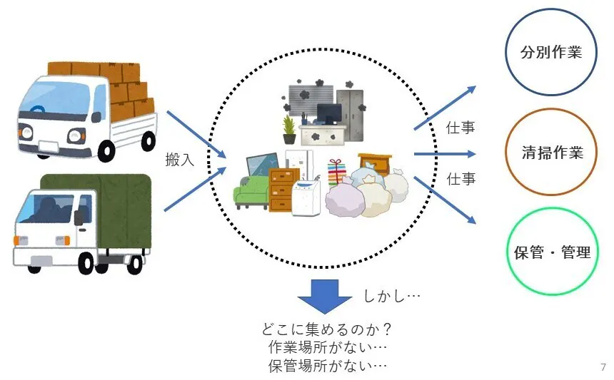 しかし、仕事の量、範囲、種類を増やす為には、多大な回収品の保管場所や分別や清掃する為の作業場所必要となってきます。