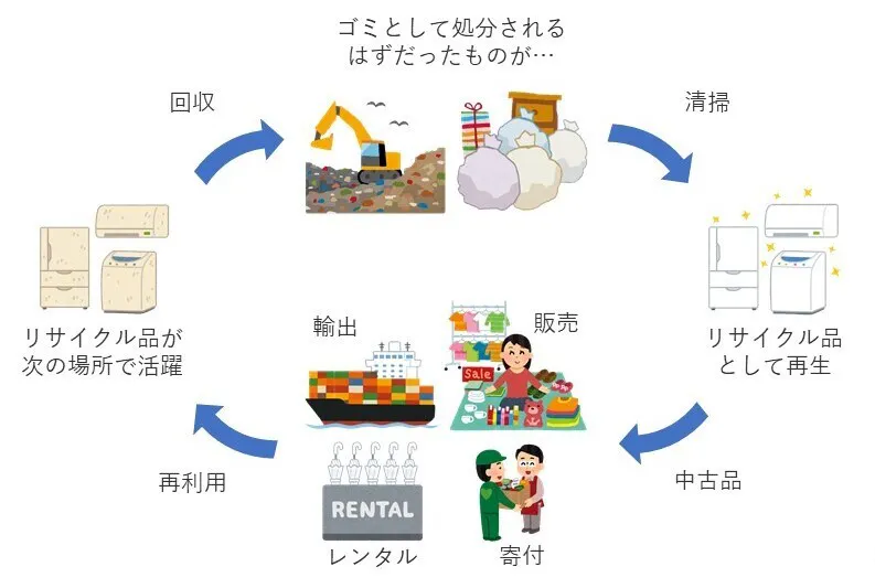 具体的には、需要のある家電製品などはインターネットで販売したり、レンタル品として貸し出すことができますし、使用できない電化製品は分解して金属などの資源を取り出して売却します。日本では需要はないが海外では需要があるものは輸出します。廃校には教室というスペースがあるのでジャンルごとに振り分けして格安での中古品販売も検討中です。冷蔵庫、洗濯機、家具、食器、小物などの生活に関するものを各教室に分けて展示し、障がい者の方や地元の方々に格安で提供できればと思っております。
