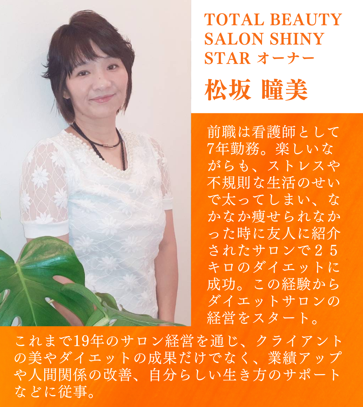 はじめまして!Total Beauty Salon Shiny Star オーナーの松坂瞳美と申します!数あるプロジェクトの中からご覧いただきありがとうございます!