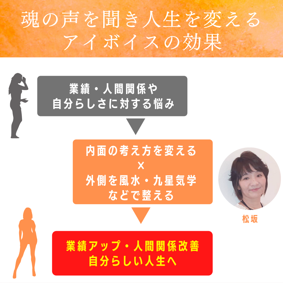 これらの事例①〜③の変化の秘密は、内面の潜在意識を変えることと、外側を風水・九星気学などで整えることをかけ算した、「アイボイス」というオリジナルメニューにあります。この「アイボイス」の存在を知っていただき、人生に前向きな方、笑顔を増やしていきたいのです!