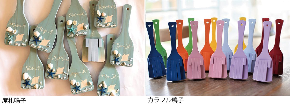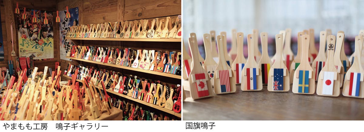 会社を立ち上げた昭和48年には、鳴子は仕入れの形で取り扱ってきましたが、もっと綺麗で丈夫で喜んで頂ける鳴子を作りたい!と、平成8年から自社で製作するようになりました。当初鳴子は定番の朱色の鳴子だけでしたが、今では皆さんが普通に使われてる片面鳴子、スペシャル鳴子を考案したのはやまもも工房です。他にもグラデーション鳴子、花鳴子、鳴る鳴子、ウエディング鳴子なども考案してきました。