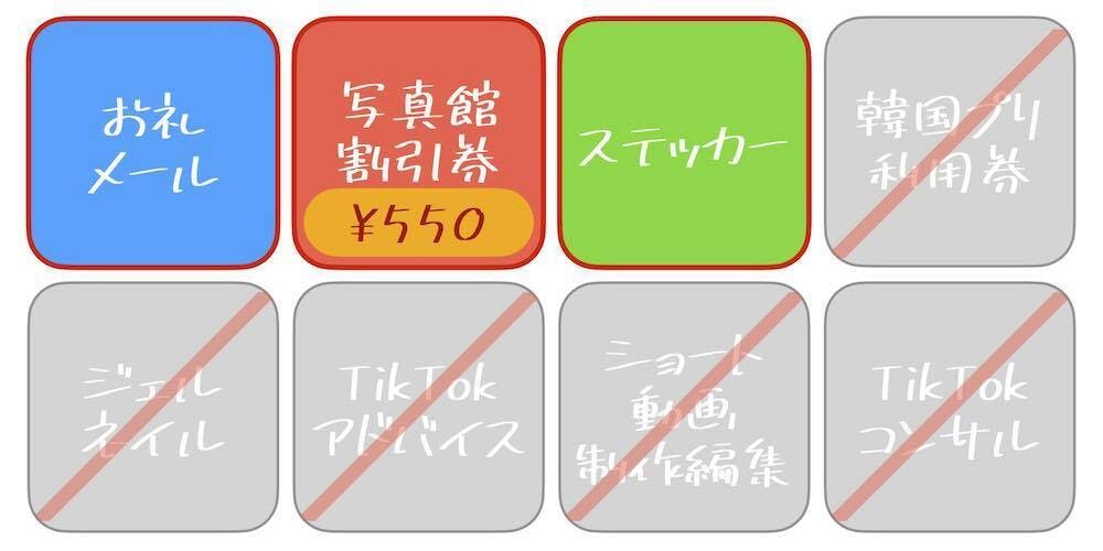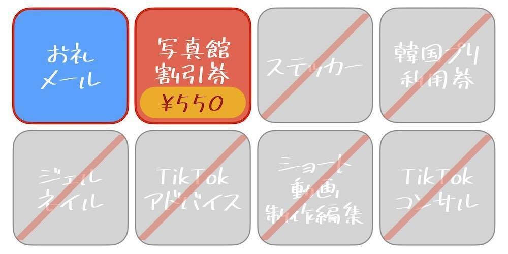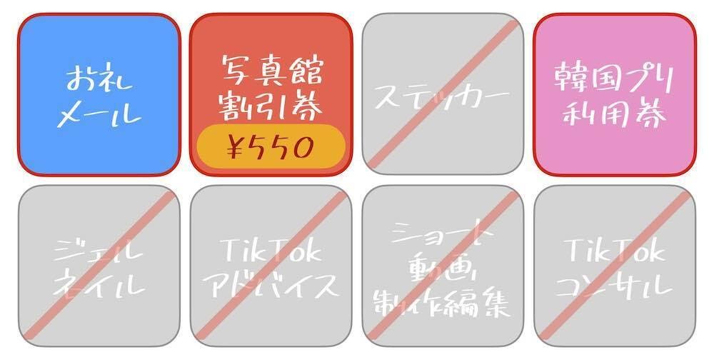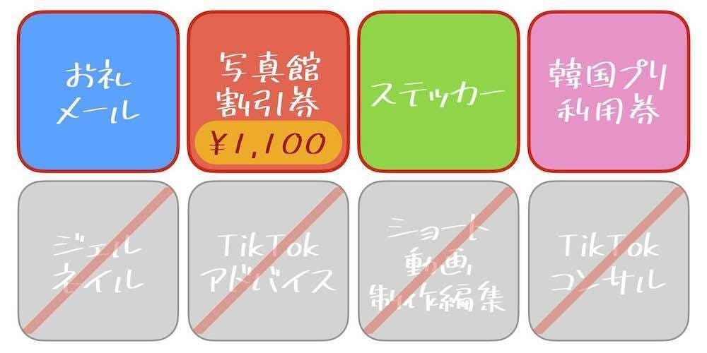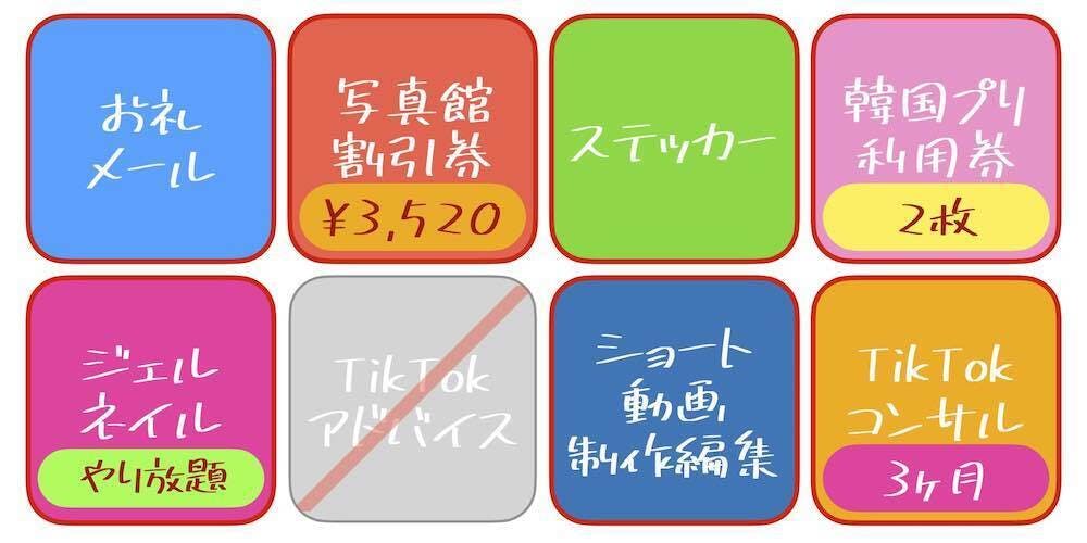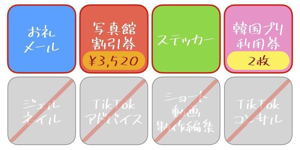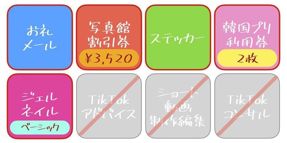 ・セルフ写真館割引券・プリクラ利用券・ワンポイントアドバイス・動画制作代行