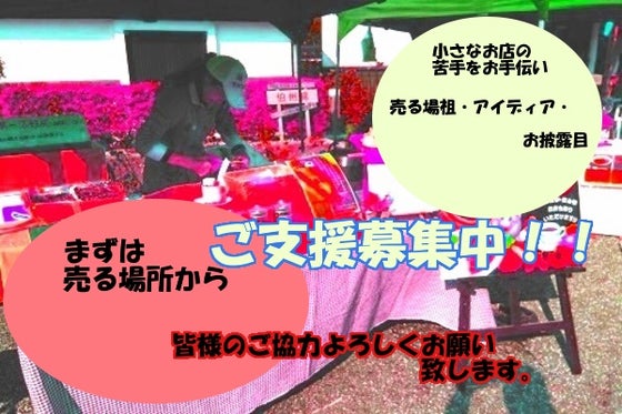 これまでのホームページでは個人事業者の売り上げには正直結びつかない為、マルシェ(市場)を考えました。協力してくれる事業所もあり、会場は出来たのですが、地代・設備・設置・保険料・勉強会etc費用が掛かるため、ホームページ作成の様に経費が掛からないと言う訳には行かなく、経費の一部を当サイトでを受けられないかと考えました。