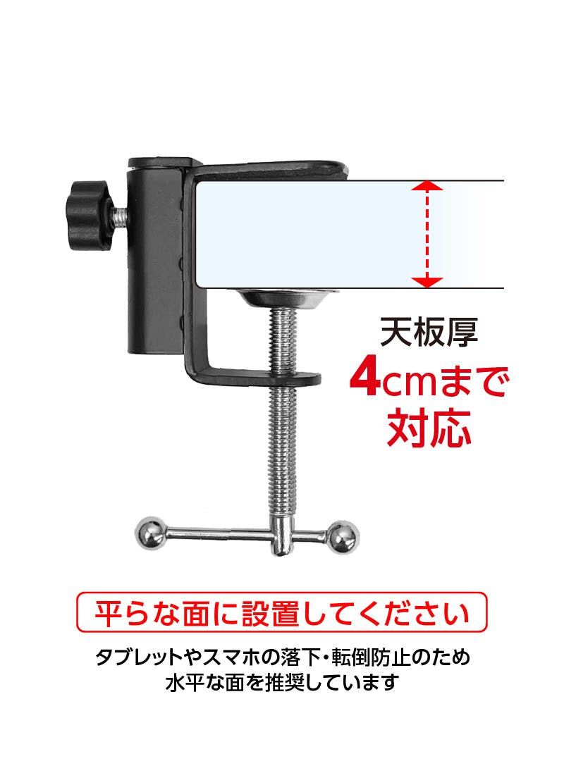 保護パッド付きのクランプ式により、天板を傷めないため、どこでも自由に取り付け可能。