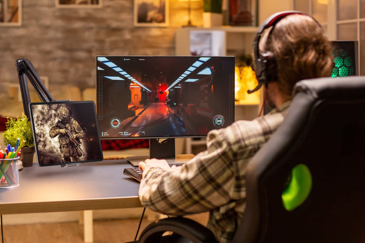 サブモニターのアームスタンドはもちろん、激しい操作を必要とするゲームプレイの揺れにも対応。