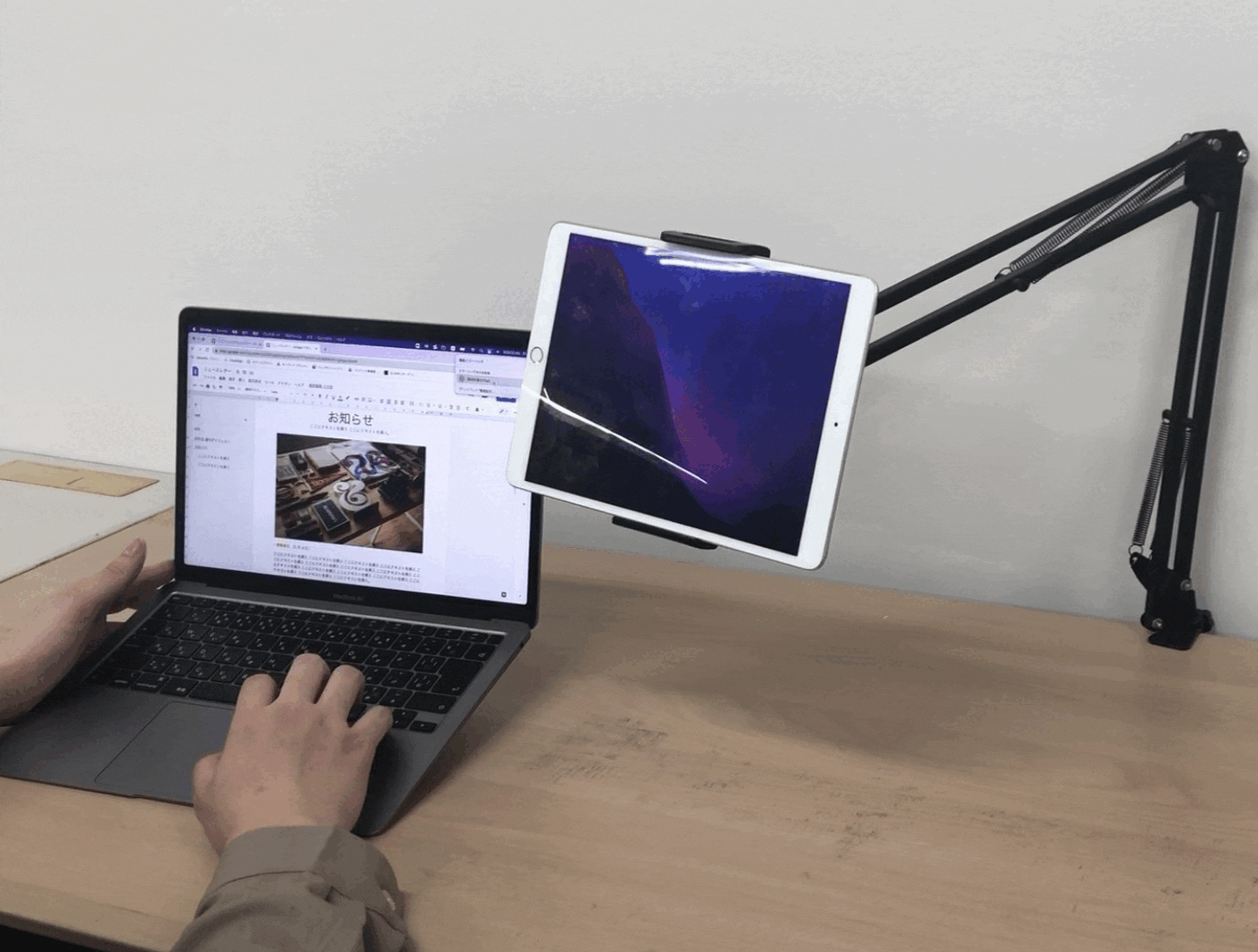 サブモニターを使って仕事効率アップ!使わない時はアームを畳んで、デスク周りもスッキリ。