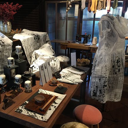 ↑各テーブルには木工トレイとおちょこ、墨絵のセットを展示。