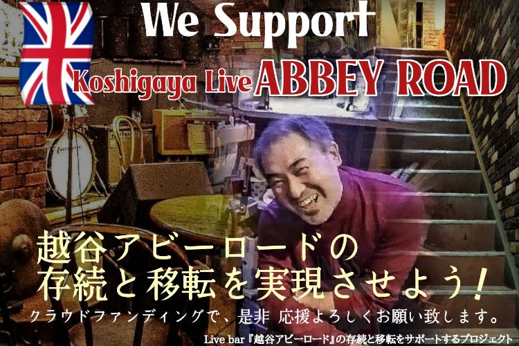 ご覧いただきありがとうございます。こちらは『越谷 LIVE ABBEY ROAD』 の存続と移転を実現するために、マスター江口勝也と有志により結成されたプロジェクトです。このコロナ禍の大変な時期に建物の老朽化により移転を余儀なくされピンチに陥っています。ぜひとも皆様のお力をお借りしたくクラウドファンディングを立ち上げました。ご賛同いただけましたら幸いです。