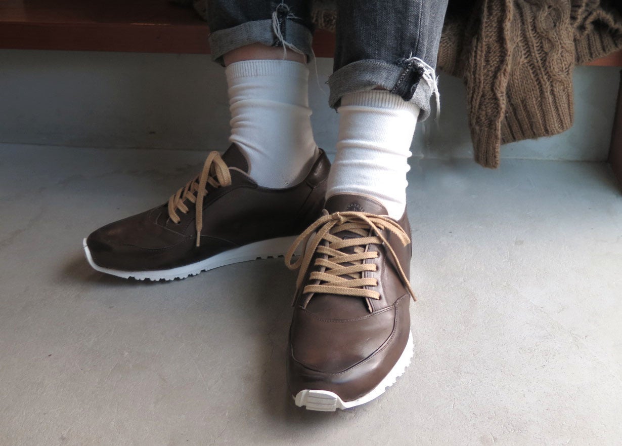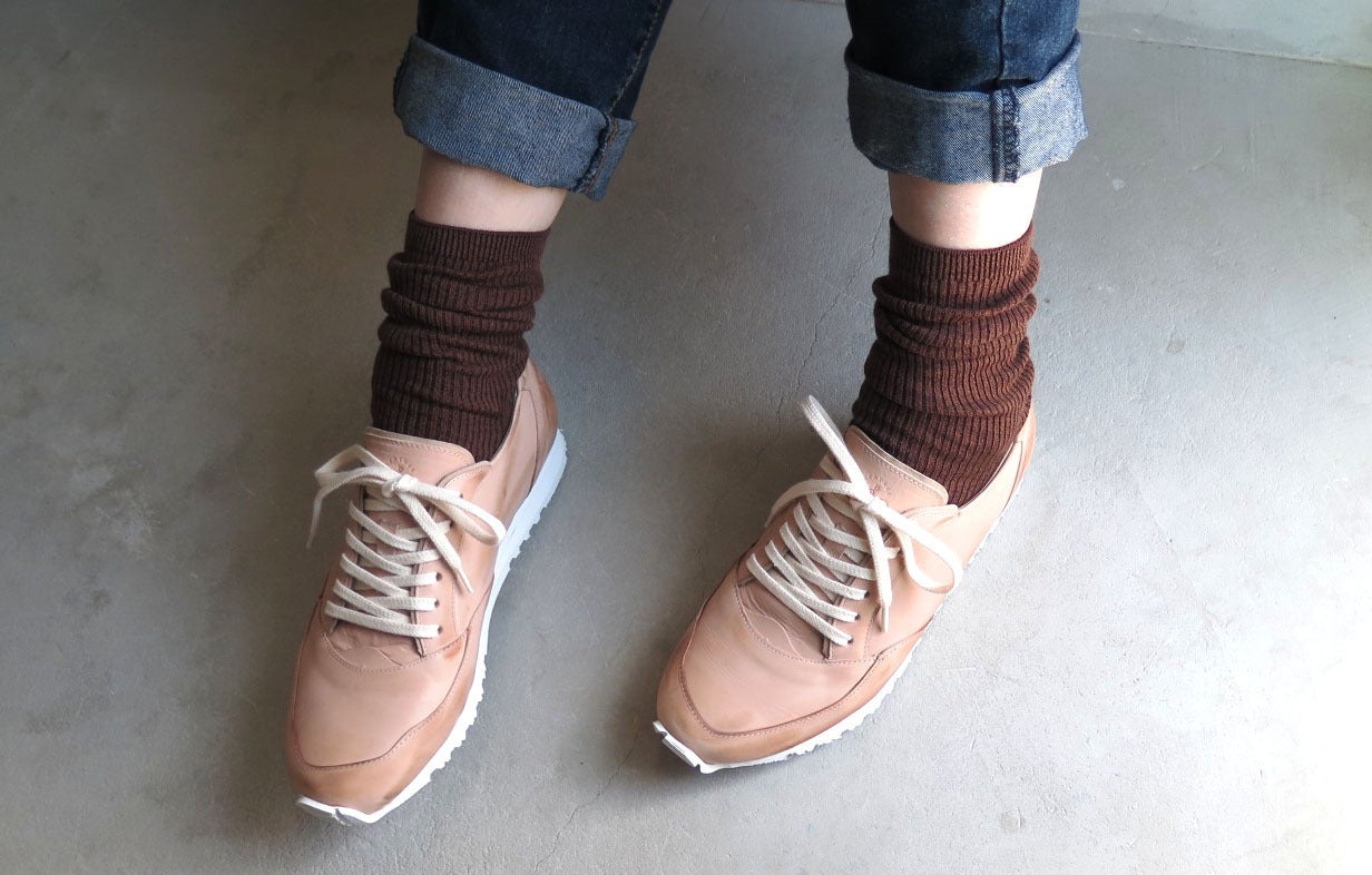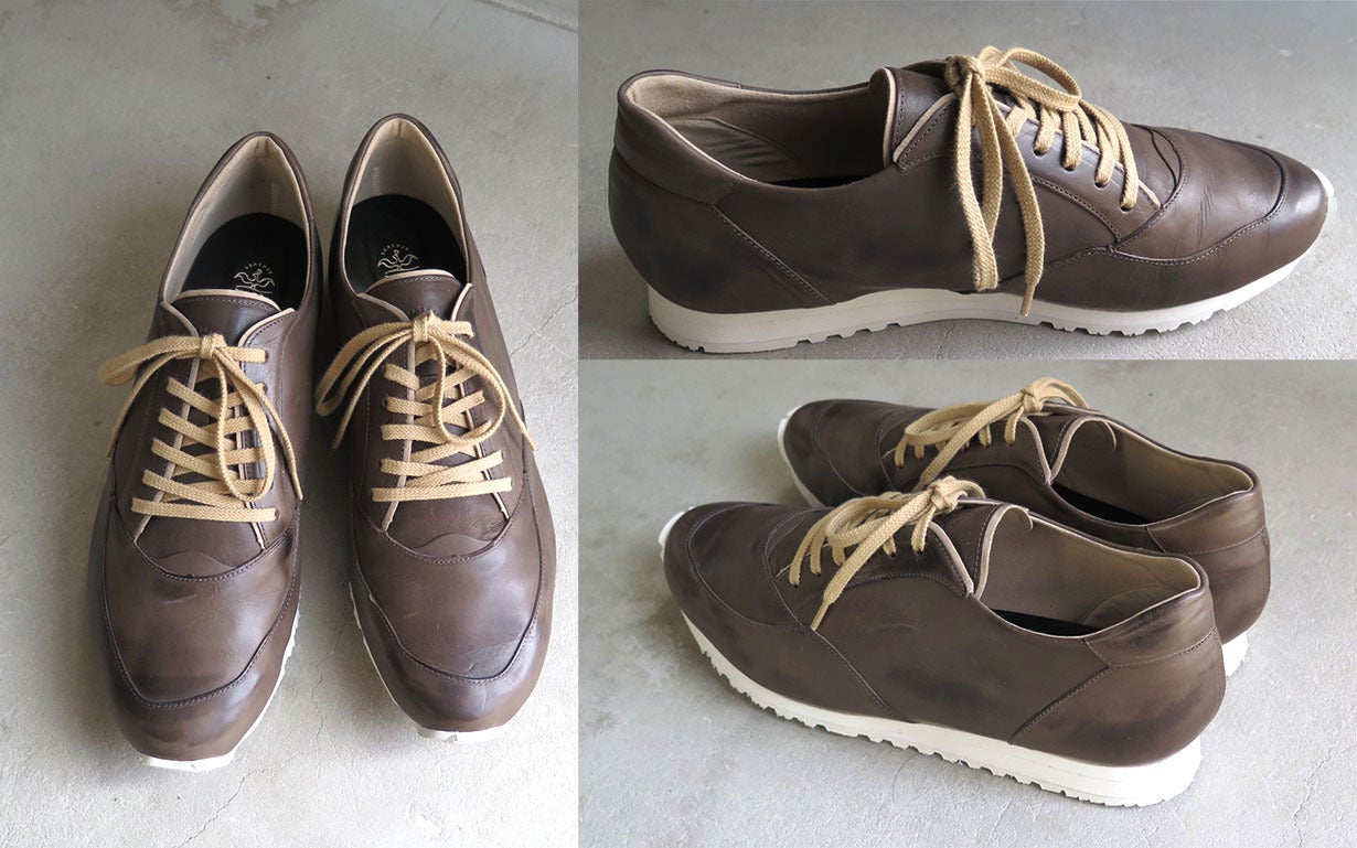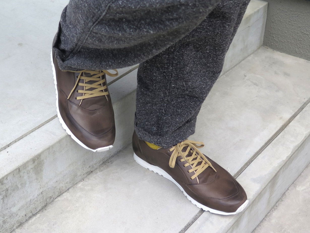 ヌメ革本来の風合いを生かしワックスにてバフ(焦がし加工)を施すことで、”大人のレザースニーカー”をデザインしました。