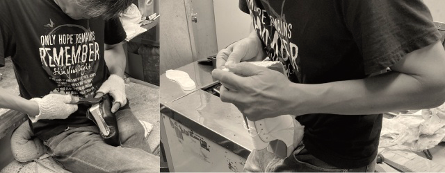 焦がしの工程は職人が1点づつ丁寧にワックスがけをして制作しています。