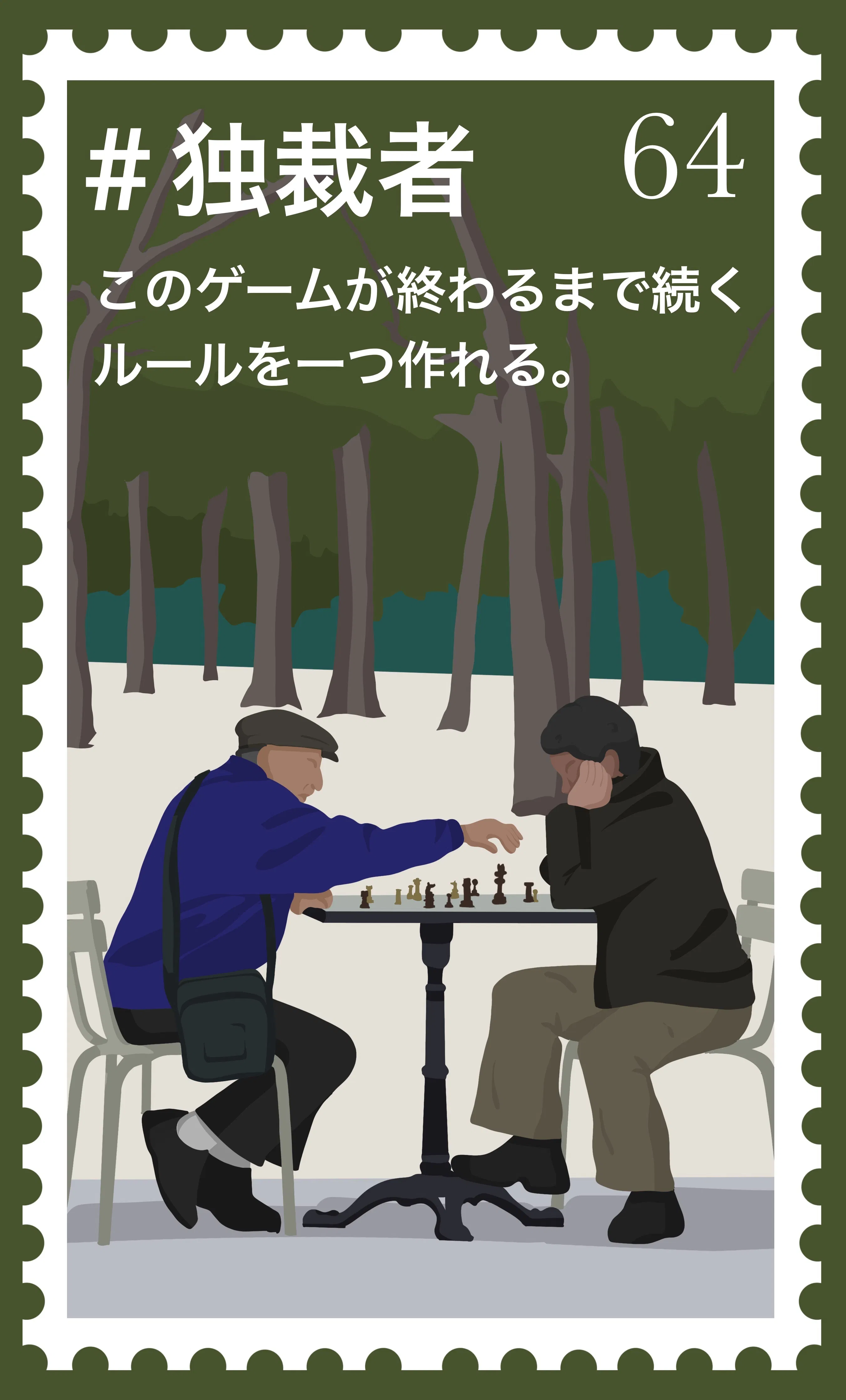 例えばこのカードは「#独裁者」。そして、デザインとしてヨーロッパのおじさん二人が自然いっぱいの公園でチェスをプレイしていますね。チェスをプレイしていることは「#独裁者」とどのような関係があるのか。このように考えながらプレイしていただきたいです!