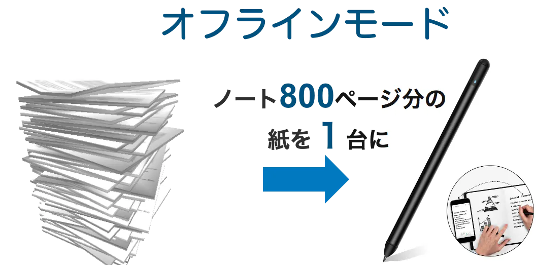 DIGIPEN本体には32MBの内蔵メモリを搭載しており、未連携状態(オフライン)でも「ノート約800ページ分」の内容を保存可能です。