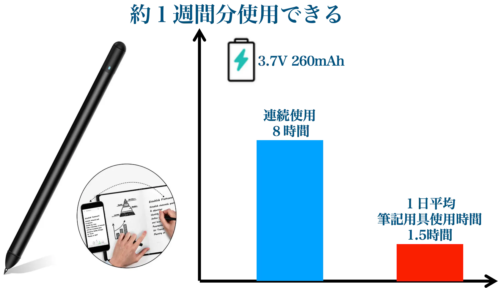 DIGIPENは約1.5時間の充電で8時間の連続使用が可能。終日の出張や会議でもバッテリー切れの心配は無用です。