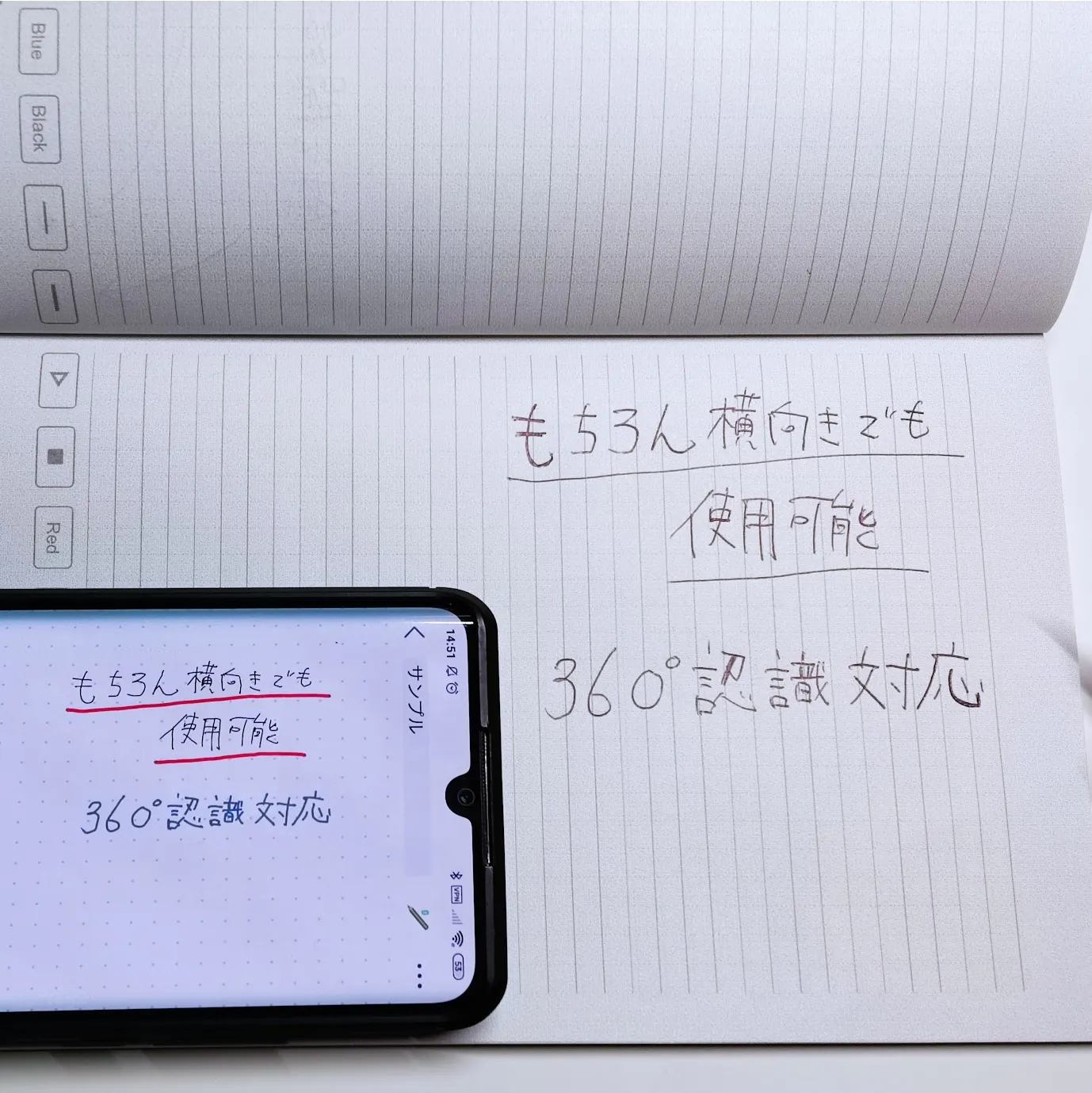 ノートが横向きの状態で書き込んでも、ペン先がどの方向を向いていても、問題なく機能します!