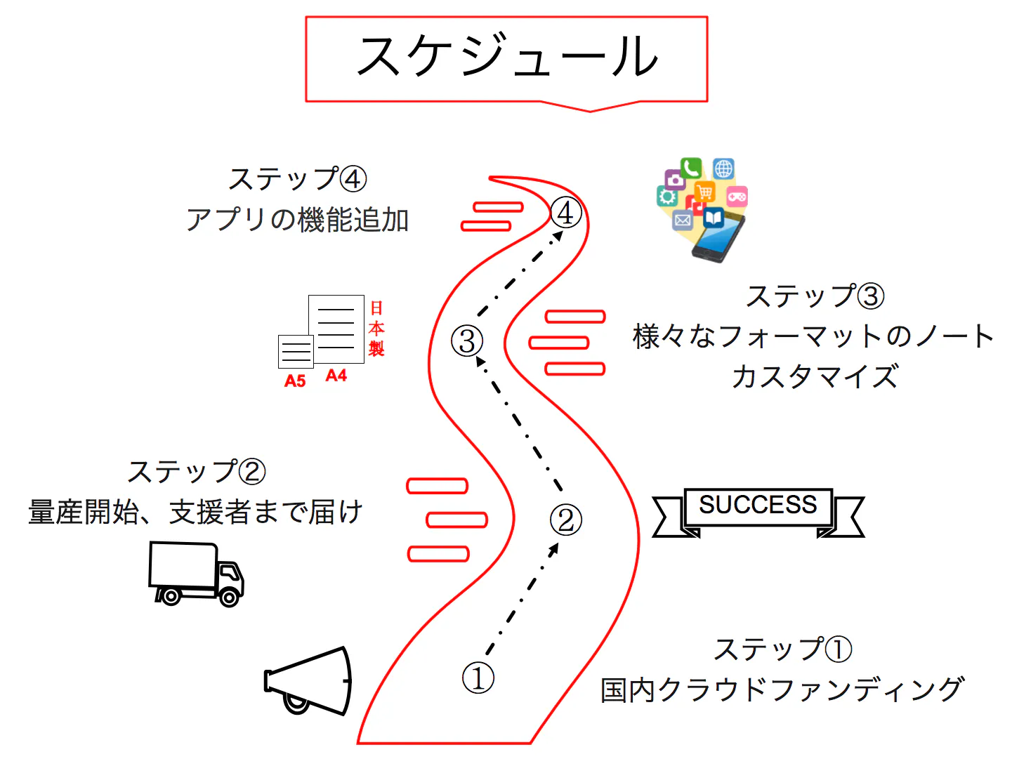 ④ 本プロジェクトを通じて、より高品質な日本製ノートが生産できるように努め、国内メーカーをサポートします。