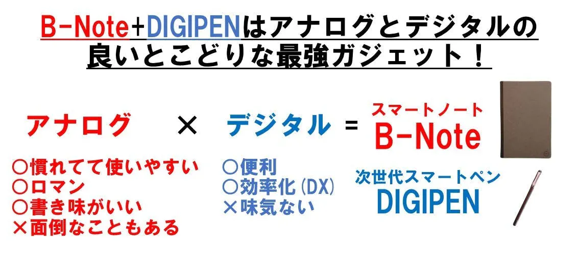 A5サイズの専用開発"B-Note"にDIGIPENで書いた内容を、専用アプリとBluetooth連携するだけで電子テキスト化出来ます!