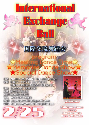 2017/12/27 16:44このたびのキャンプファイヤーで実現したいことの一つ 『International Exchange Ball ~ 国際交流舞踏会』の ポスターが出来上がりました! 社交ダンスを通じ、沢山の世代間の交流から更に広げ、 国を超えた交流を楽しく行っていけたらと思っております。 Cha cha Girls パフォーマンスはもちろん、プロの方々によるデモンストレーション もちろん、ご参加の皆さまに気軽にお楽しみいただけるダンスタイムもございます。 是非、沢山の方のご支援を心よりお待ちしております。 どうぞ、宜しくお願い致します! 日時:2018年2月25日 13:00〜 ( 16:00頃終了予定ですが、変動の可能性もございます ) 場所:札幌パークホテル( エメラルド ) チケット:お一人様 1枚 13,000円 It's news of an event more than Cha cha Girls "International Exchange Ball " time: February 25, 201813:00- (It's expected to end around 16:00, there is also a possibility of the fluctuation.) place: Sapporo Park Hotel (emerald) ticket: One person 1 13,000 yen By which I expand more from an exchange during a lot of generations through a social dance and think if you can interchange happily beyond a country Cha cha Girls Demonstration by a professional person as well as a performance I'd like to have everybody enjoy itself casually, and I also prepared the dance time I'm waiting for all means and person's a lot of arrival more than a heart. Please, thank you! もっと見る