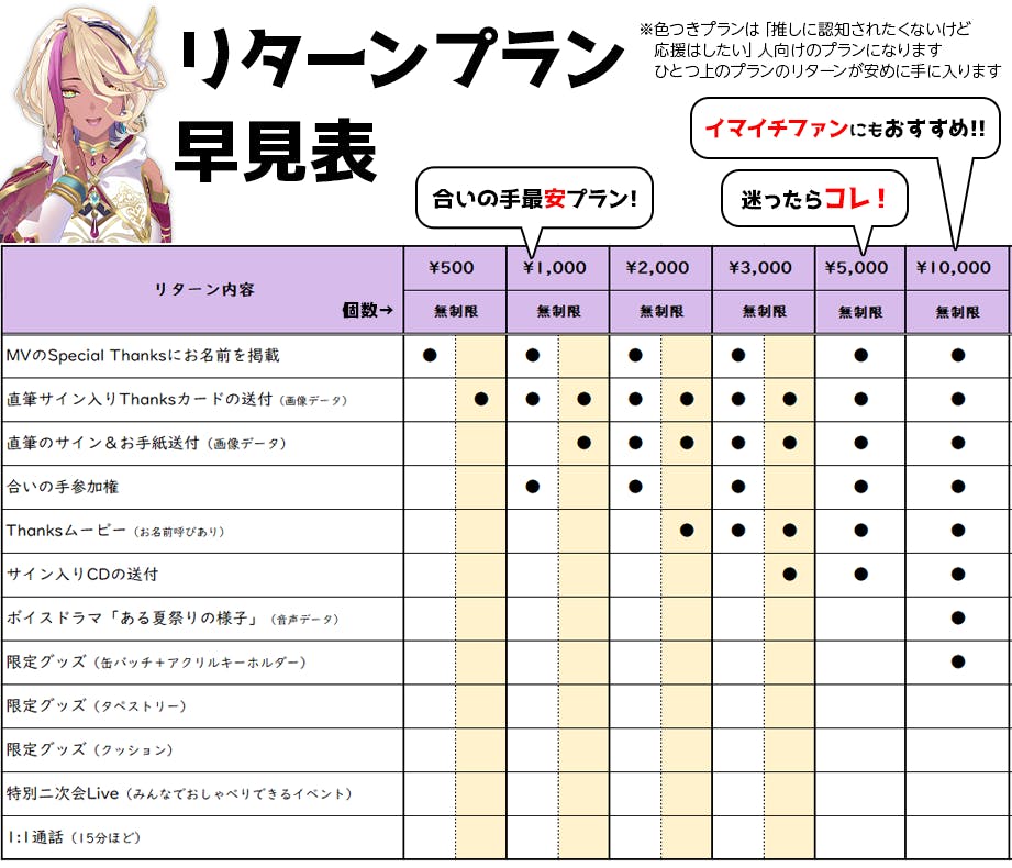 …MVにお名前が掲載される、合いの手が入る、グッズ入手などのスタンダードプラン