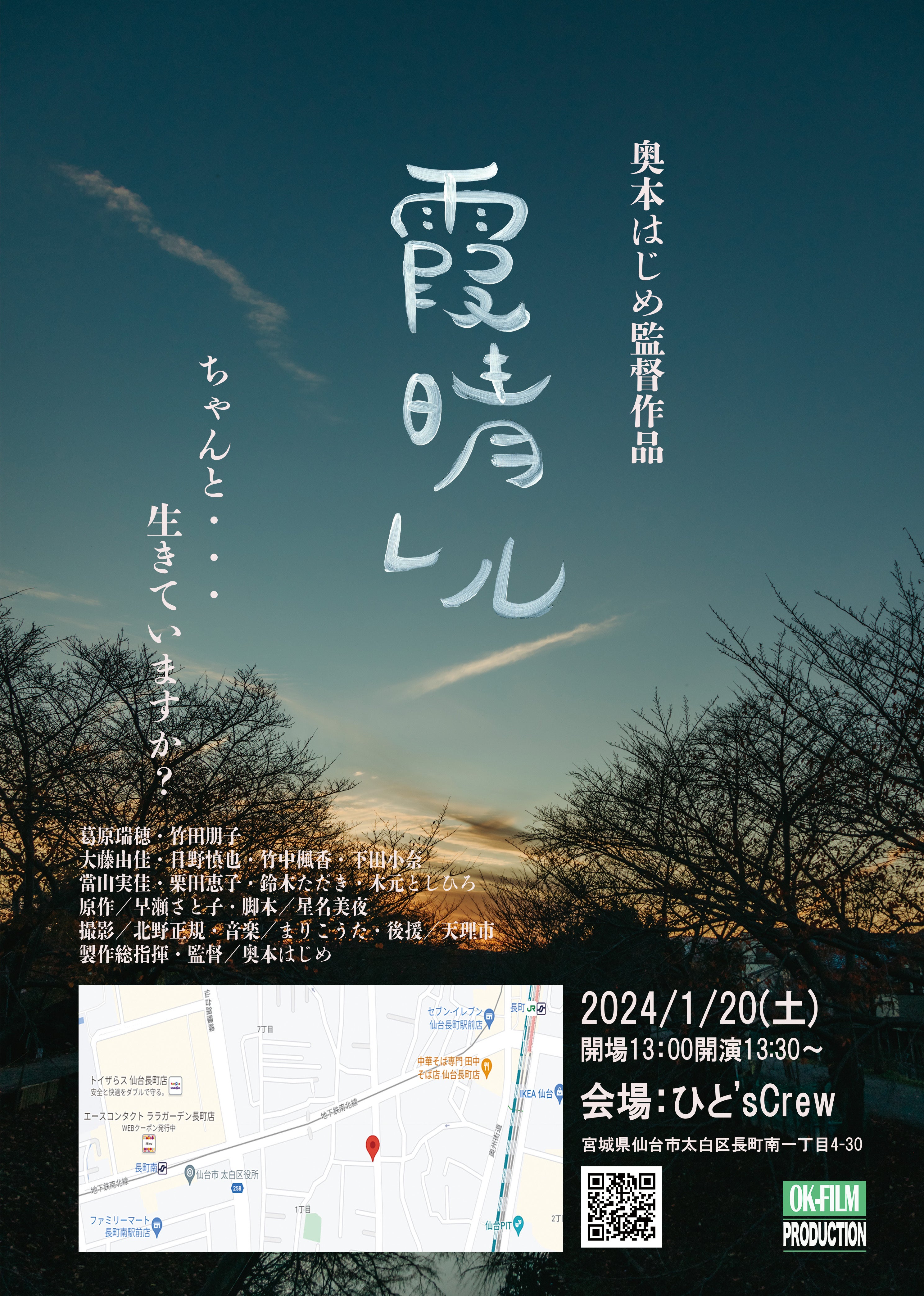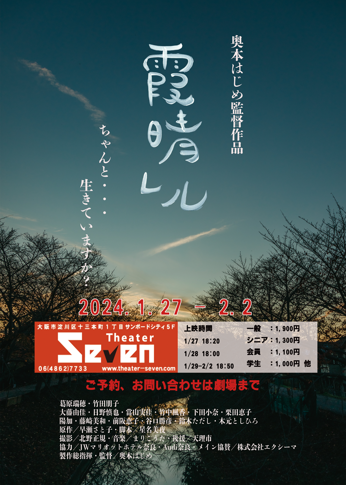 2024/01/16 10:29「霞晴レル」が大阪・十三シアターセブンにて公開されます。もしお時間ございましたらぜひお越しくださいませ。なお、本上映は一般公開上映となりますので、リターン対象とはなりません。予めご了承くださいませ。また、上映時間、予約などお問い合わせも劇場となります。上映会場:シアターセブン大阪市淀川区十三本町1丁目7−27 サンポードシティー 5階電話: 06-4862-7733https://www.theater-seven.com/(上映日程)■1/27(土) 18:20(~20:02)■1/28(日) 18:00(~19:42)■1/29(月)~2/2(金) 18:50(~20:32)※2/2(金)まで一般:1,900円シニア:1,300円会員:1,100円(同伴割引:1,300円 ※1名迄)学生: 1,000円障がい者割:1,000円(同伴割引:1,000円 ※2名迄)子ども:700円(3歳以上小学生以下)他館提携割引:1,600円淀川区民割引:1,300円(淀川区にお住まいの方)U30ペア割引:3,000円(おふたりとも30歳以下の場合)月曜・金曜ペア割:2,600円水曜サービスデー・ファーストデー(1日):1,300円 もっと見る