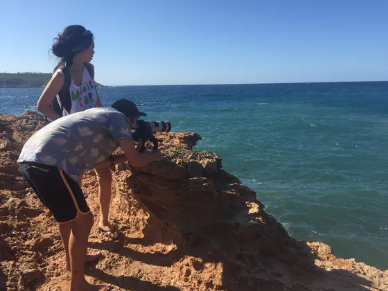 これカメラマンがモニターを見れるように、太陽の光を私の影で隠しているんです。