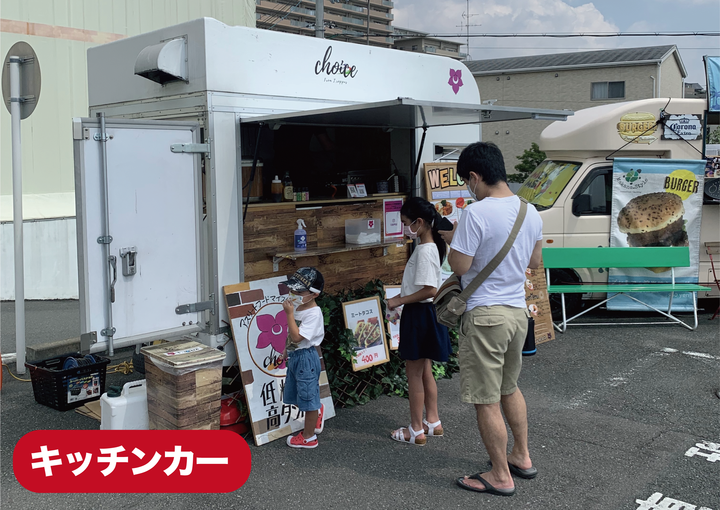 駐車場やテニスコートにて、「射的」「すくいもの」「輪投げ」などができるエリアと、今TVや巷で人気な「キッチンカー」にご出店いただき、子供のみならず大人も楽しめるエリアを提供します。