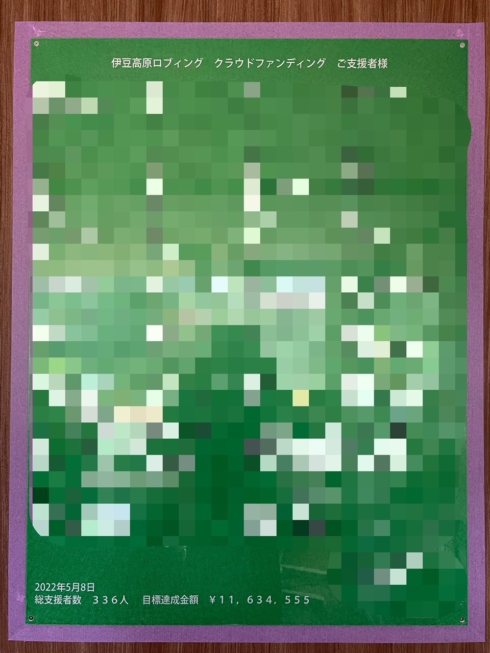 みなさま!お久しぶりでございます。伊豆高原ロブィングです。クラウドファンディングでは、ご支援を頂きまして本当にありがとうございました。リターン内のロブィング応援で施設内にお名前を掲示するとの事でご支援を頂きました方々のネームプレートが完成を致しましたのでご報告をさせて頂きました。本館ロビーにて掲載をさせて頂いております。予定よりも大幅に遅れてしまいまして、誠に申し訳ありません。材料や加工などの作業過程で社会情勢の諸々の影響もありまして予想よりも時間が掛かってしましましたが、イメージより良いものが出来ました。個人名での掲載もありますのでWEB上ではお名前が分かるようにはしませんでしたが是非、直接にご来館を頂いて、お名前を確認して頂けたら嬉しいです。施設の再建(パデルコート)の方ですが、当初の予定より遅れております。補助金の活用により、より良いものを建設する方向で進めております。楽しみにしておられる方々からもご連絡を頂いております。誠に申し訳ありませんが、もうしばらくお待ちください。完成時期の目処が付きましたら、またご報告をさせて頂きます。今後とも、どうぞよろしくお願い致します。