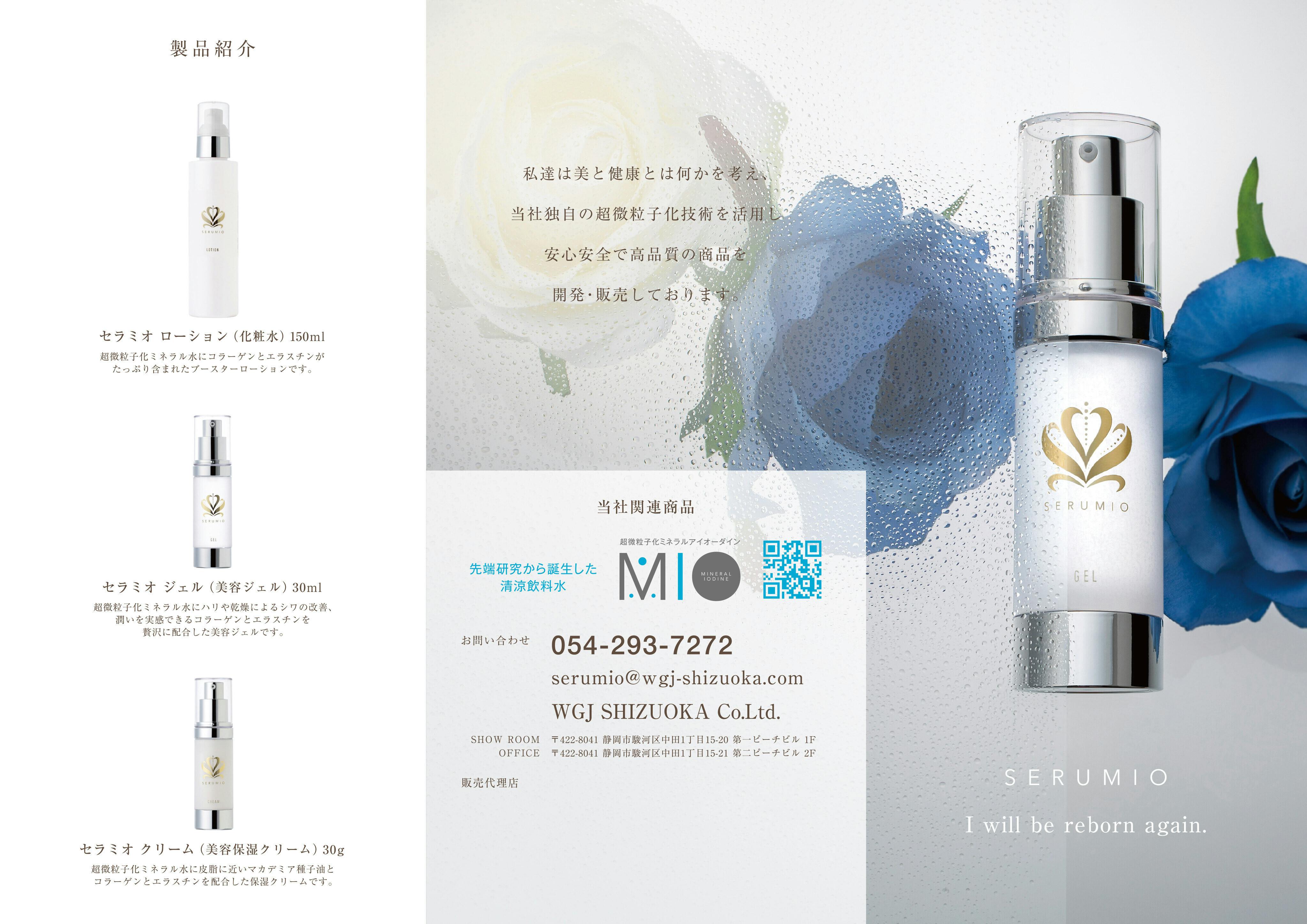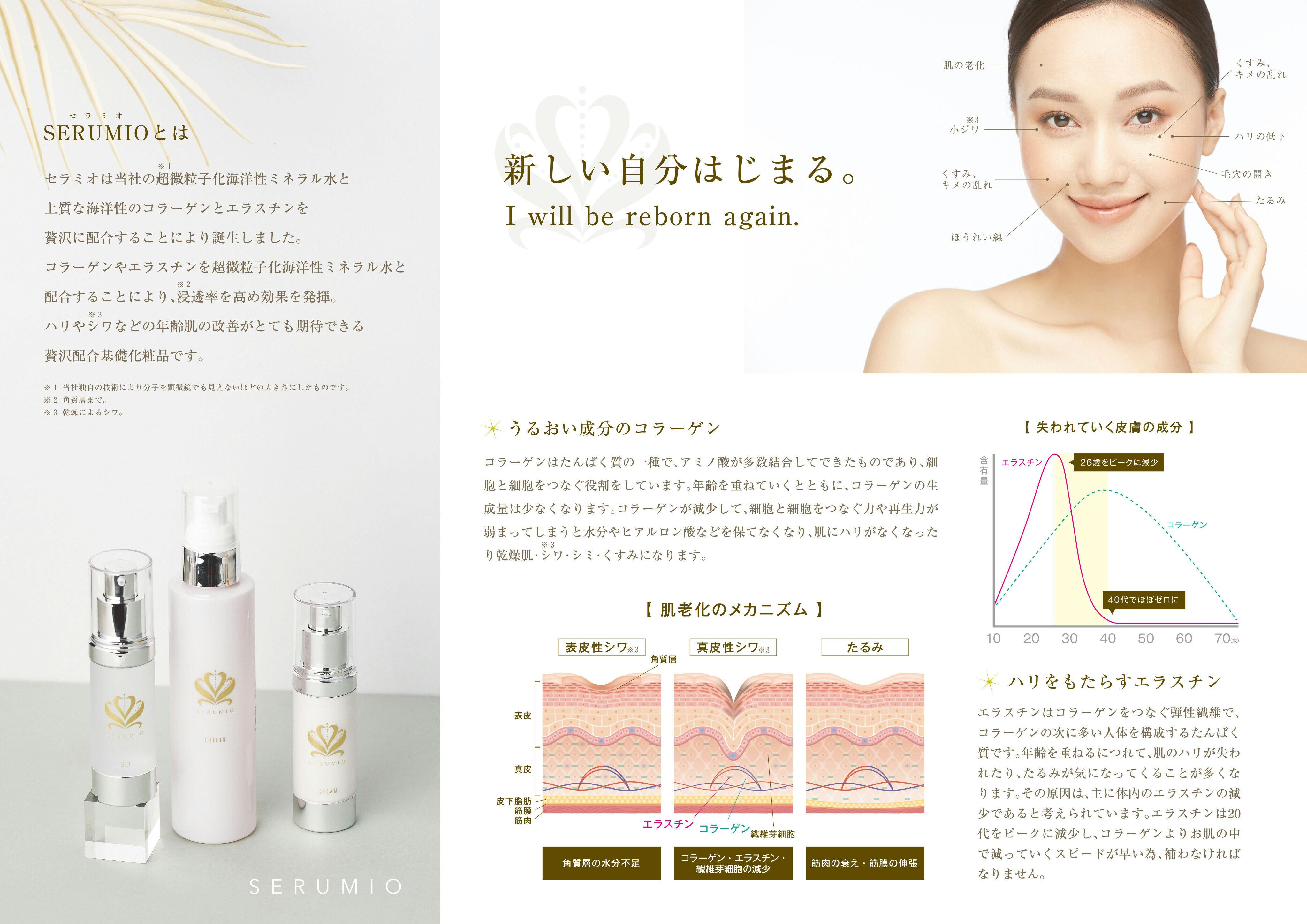 セラミオ(SERUMIO)基礎化粧品は当社独自の超微粒子化海洋性ミネラル水に海洋性コラーゲンと海洋性エラスチンを驚く程贅沢に配合し、浸透率(角質層)が高くハリや潤いが持続する基礎化粧品です。