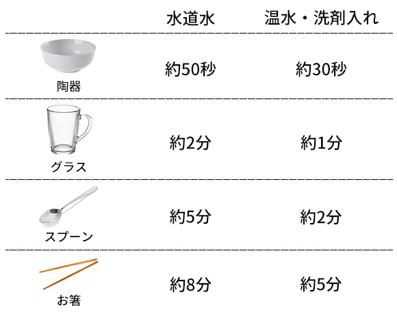 注:上記の洗浄時間はおおよその目安です。汚れ物や食器の素材、汚れ程度、食器数、並み方などにより、洗浄時間の差が生じるため、予めご了承ください。