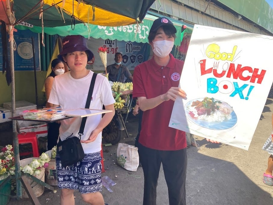 カンボジアに行き、クイテウ屋の第二の定番メニューを作るためマーケティングをした我々は「サーモン寿司」という結論に達しました。そして、これを売り始めたところ・・・全く売れない!そこで出た言葉が「この市場の人たち、日本文化とか、1ミリも興味ないですわ」日本から来た我々や、日本人が支援している小学校で学んだことがあるクイテウ屋のスタッフは、日本に特別な感情を抱いています。イオンモールに来るようなカンボジア人は日本だけでなく、いろんな国の料理に興味があります。でも、このローカルの市場に来ているカンボジアの人たちは、日本料理なんて興味がない。下手すりゃ、日本がどこにあるかも知らない。「じゃあ、なんで試食してくれた人たちはサーモン寿司を美味しいと言ったの?」「それは、彼らがいい人だから。タダでくれた物を美味しいと言わないのは失礼だとおもったから」と、いうわけで、方針を一気に転換しました。「この市場のカンボジア人が一番好きなものを売る」改めてリサーチを行い、焼いた豚肉をご飯の上に置いた「豚肉ご飯 LUNCH BOX」を売ることにしました。最初は店の前だけで、でもだんだん、市場に入って、市場の人たちと話をしながら売っていったら、どんどん売れました。彼らは、日本文化には興味はないけど、自分たちに話しかけてくる人たちには、非常にやさしく接してくれるのです。となりのお店に人に「買ってあげなよ」って言ってくれたり、「家族の分も買っていくよ」って3つ買ってくれたり。おかげで、80個以上売ることができました。このランチボックスは、クイテウ屋さんの定番メニューとして、我々から引き継がれ、今も売られています!