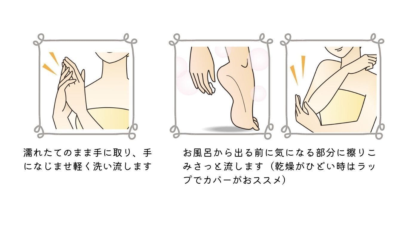スクラブで古い角質を優しく取り除き洗い流してください。また、カサカサがひどい場合は、ペーストしたSugarbooを塗布しラップでパックしてください。暫らくおいて洗い流してください。硬くなった角質をやわらかくすることで、ガサガサが気になる部位が徐々にツルツルに。