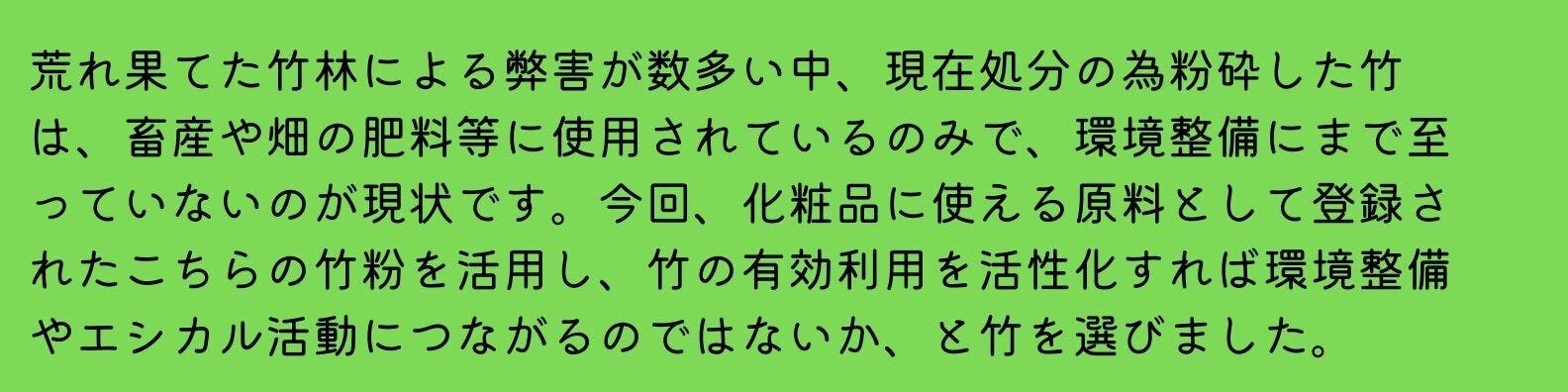 荒廃した竹林を美しい竹林に再生成するため、伐採した竹を活用し、化粧品として有効活用できれば資源を無駄にすることはないと考えています。