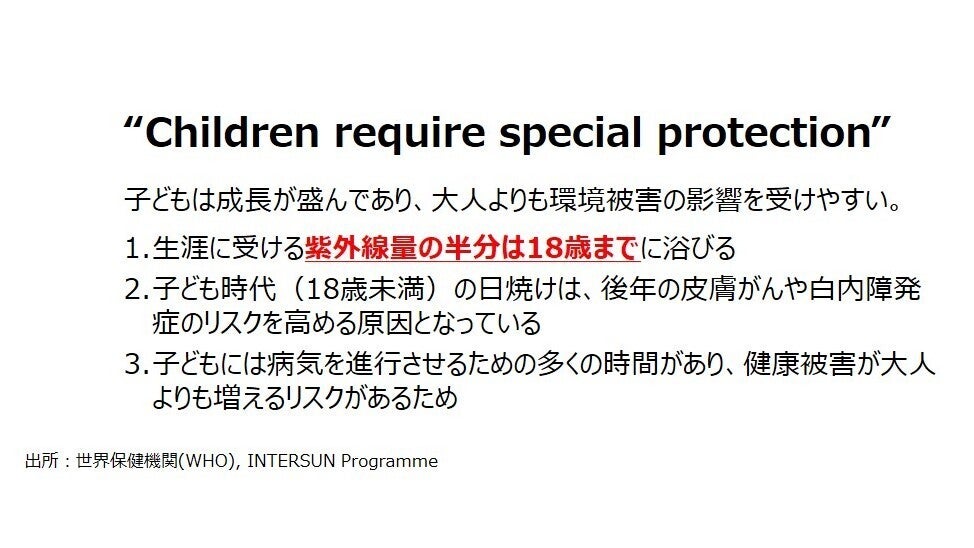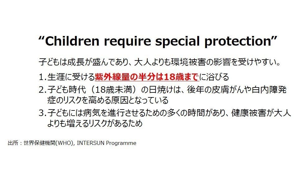 一歩踏み込んで、さらに衝撃的な事実は、WHO発表の「生涯浴びる紫外線量の約半分は18歳までに浴びている」という公式見解です。子どもたちは大人よりも屋外で過ごす時間が長いことが理由とされています。*3