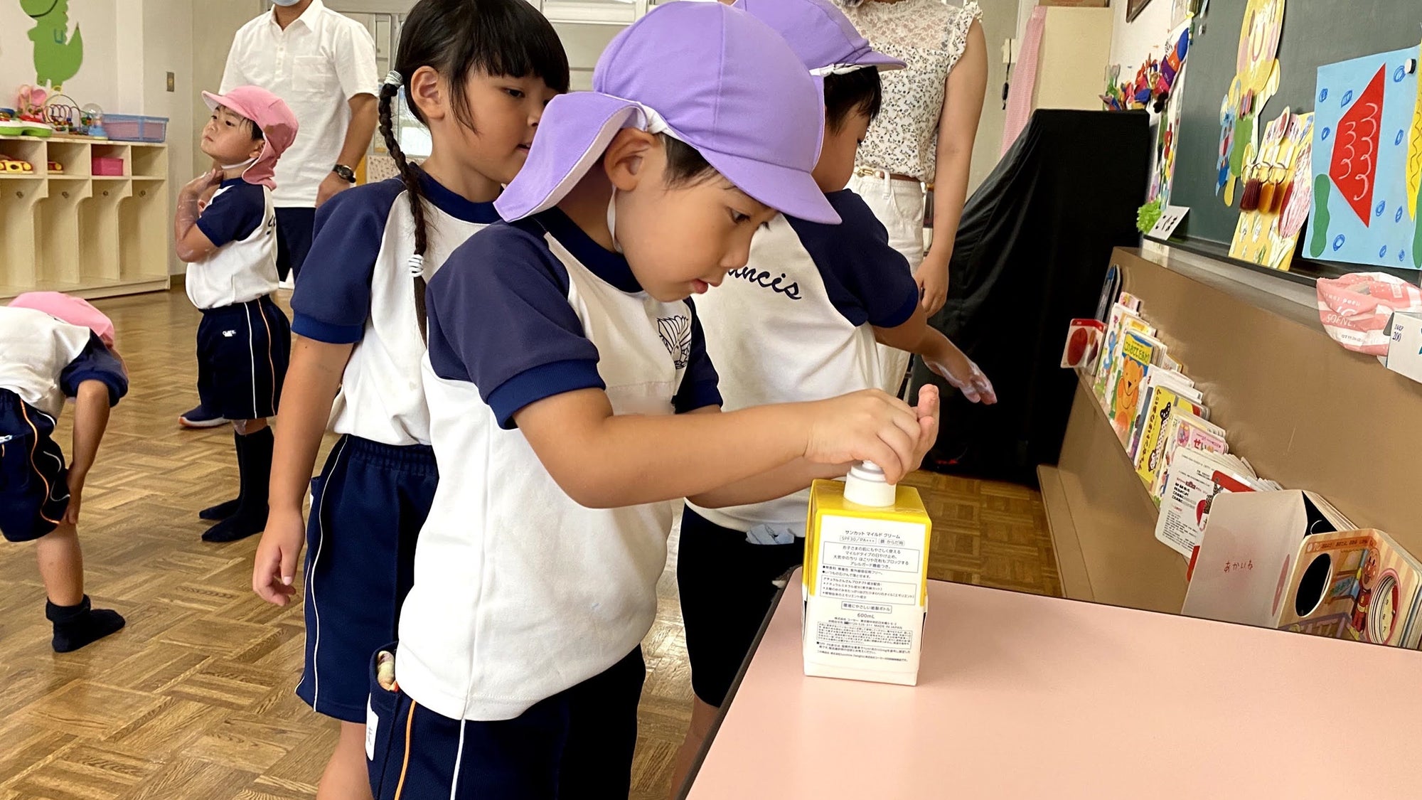 私たちが実現したいことは、子どもたちが小さいころから日焼け止めを「自分で、楽しく」塗る習慣を定着させることです。そのため、「なぜ日焼け止め?」、「どうやって塗るの?」を解決できる紫外線対策教材をセットで導入しています。
