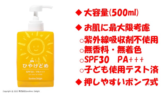 設立から3年、Sunshine Delightは保育施設の先生方にいただいたお声をもとに、「塗りやすさ」、「手間にならない」を心掛け、『大容量』×『子どもも安心して使える』×『子どもたちが自分で塗れるように絵本・歌の紫外線対策教材つき』のサービスを展開しています。