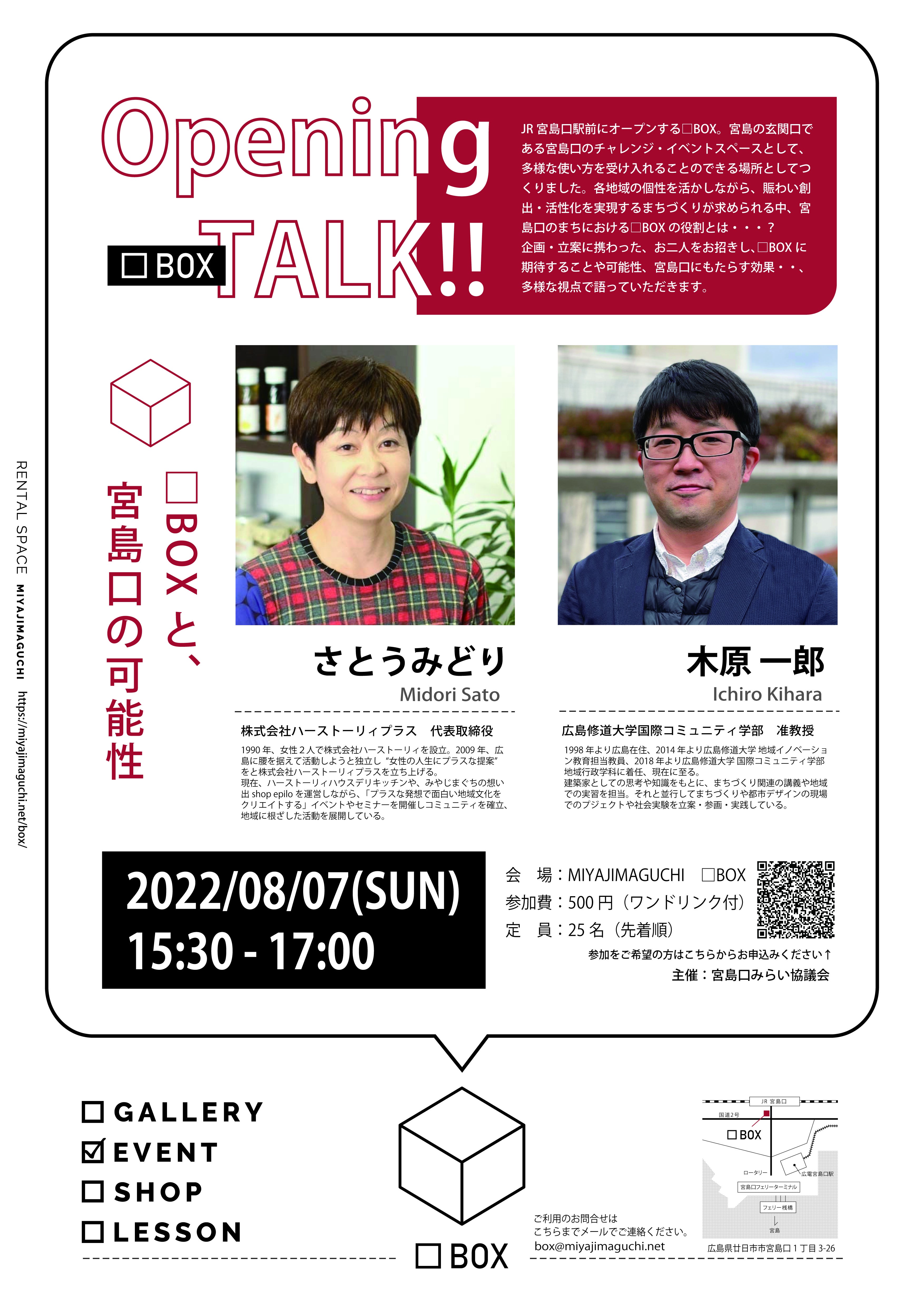 10/22 イベントを開催します!!!『みやじまぐちがく』と題し、宮島口を「学」ぶことで、もっと「楽」しんでいただきたい。そんな想いから企画しております。当日は□BOXの空間に、宮島口の過去の風景写真を展示します。現在のまちの風景との変化を愉しみながら、宮島口のそぞろあるきを楽しんでもらえればと思います!イベント内容は以下の通りです。■10:00-16:00 宮島口で まぁ一服どうぞ(喫茶去)宮島口へお越しになられた皆様にお茶をお淹れします。ほっと一息つける時間を過ごしていただくため、□BOXに簡単な茶室をつくる予定です。無料でご参加いただけますので、是非お立ち寄りください!■16:00-18:00 宮島口の歴史を語らう過去の風景写真をもとに、宮島口の歴史を宮島口みらい協議会の上野会長に語っていただきます。おつまみやお酒をつまみながら、語らいながら。。気軽にご参加いただけますので、宮島への帰りなど、夕暮れ時の宮島口を楽しんでいただけると幸いです!(参加費500円で1ドリンク付きです。2杯目からは有料となります。)※どちらのイベントも事前申込み不要です。お気軽にお越しくださいませ!□開催日時:2022年10月22日(土)10:00-18:00□開催場所:MIYAJIMAGUCHI □BOX 廿日市市宮島口1丁目3-26□主催:宮島口みらい協議会
