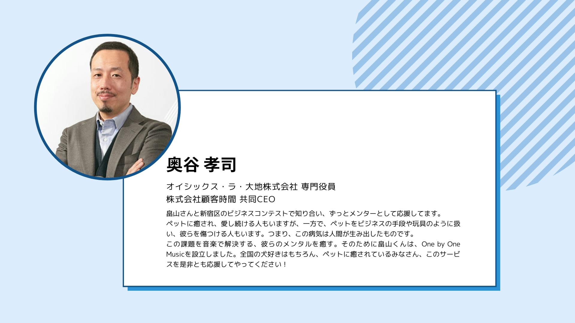 2022/12/15 07:00オイシックス・ラ・大地株式会社専門役員で、One by One Musicの熱いメンターでもある奥谷孝司さまより、応援メッセージをいただきました!畠山さんと新宿区のビジネスコンテストで知り合い、ずっとメンターとして応援してます。 ペットに癒され、愛し続ける人もいますが、一方で、ペットをビジネスの手段や玩具のように扱い、彼らを傷つける人もいます。つまり、この病気は人間が生み出したものです。 この課題を音楽で解決する、彼らのメンタルを癒す。そのために畠山くんは、One by One Musicを設立しました。全国の犬好きはもちろん、ペットに癒されているみなさん、このサービスを是非とも応援してやってください!熱烈な応援メッセージをありがとうございます。引き続き、大切なペットのための活動を進めていきます! もっと見る